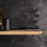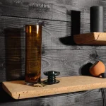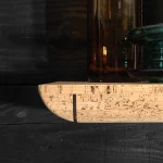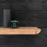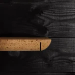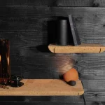 These cork shelves highlights the quality of the materials with the simplicity of Scandinavian design. Inspired by mortise and tenon wooden joints. The metal is inlaid in the cork as a subtle detail. Simple and soft shapes without superfluous details for timeless design.