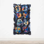 The work was entirely handcrafted using discarded sheep wool from Romania. The wool was washed, carded, and dyed using natural plants and acid dyes. It was finally wet felted and has a synthetic textile support on the back side.