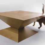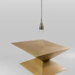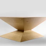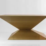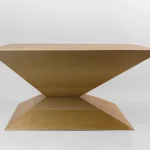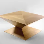 Crafted entirely from wood, this closed and hollow form is composed of two pyramid-shaped elements connected at the top with varying angles of plane inclination, ranging from 15 to 50 degrees. The larger pyramid serves as the table’s top, while the smaller one acts as a leg, giving it a unique and eye-catching look.