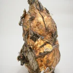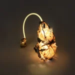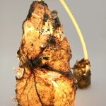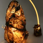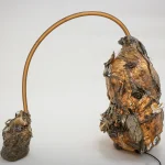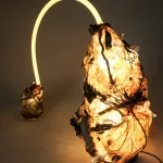 “Sympoietic” by Sabrina Merayo Nuñez delicately interlaces the realms of the human, non-human, and technological, suggesting an intricate kinship. Sabrina has innovatively formulated her own recipe for a 100% biodegradable collagen-based bioplastic, merging modern methods with time-honored medieval techniques traditionally employed for crafting paints and adhesives. With this avant-garde material, she has sculpted lighting masterpieces that engage with viewers, using state-of-the-art motion sensors. These creations seamlessly blend handcrafted elements with artfully repurposed manufactured components, such as intricate carvings, furniture fragments, veneers, and glinting crystals.