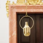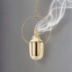 The Anicca Vanitas Censer is made from sheet metal brass. The brass pieces are hand-polished from the outside to a mirror-like finish, while the inside is patinated to create a dark brass texture. The censer will be delivered with two chains to hang it from the ceiling or a hook and to detach it. It should be used to purify the air of an environment together with scented resins or herbs. The interplay between the polished brass and the patinated inner surface reflects the tension between permanence and impermanence – a central theme of the Anicca Vanitas Collection.