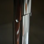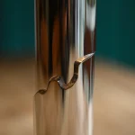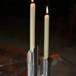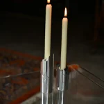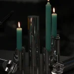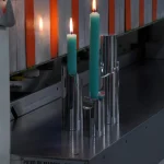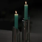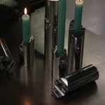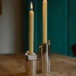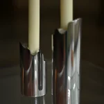 the Omphalos candle holder—a sleek set crafted from solid block of aluminum, meticulously milled to fit together with perfect precision. Each piece is hand-sanded and polished to a smooth finish