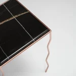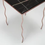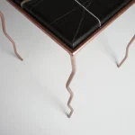 The brushed Noir marble top, with its warm and deep veins, meets a hand-crafted iron structure with wavy legs and a rose-chrome finish, giving the metal a fluid and almost biological character.