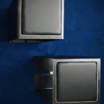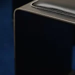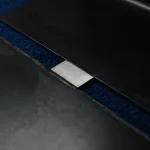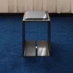 A sculptural stool made from raw steel, defined by its continuous curved form and precise geometry. The top features a leather cushion for comfort, while a polished stainless steel detail at the base introduces a refined contrast within its otherwise austere composition.