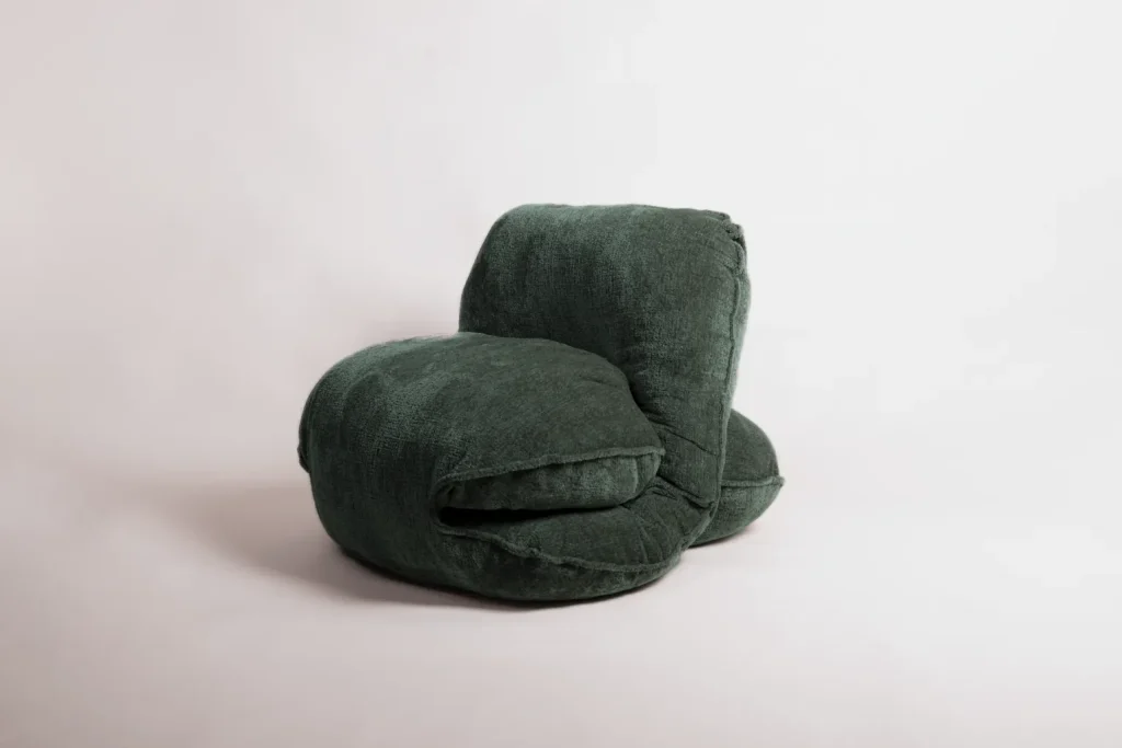 The Warrior Neckless Armchair, part of the Wool Diaries collection, combines two layers of colored felt to create a sculptural, tactile form. Resting on reclaimed oak legs, it balances craftsmanship and sustainability.