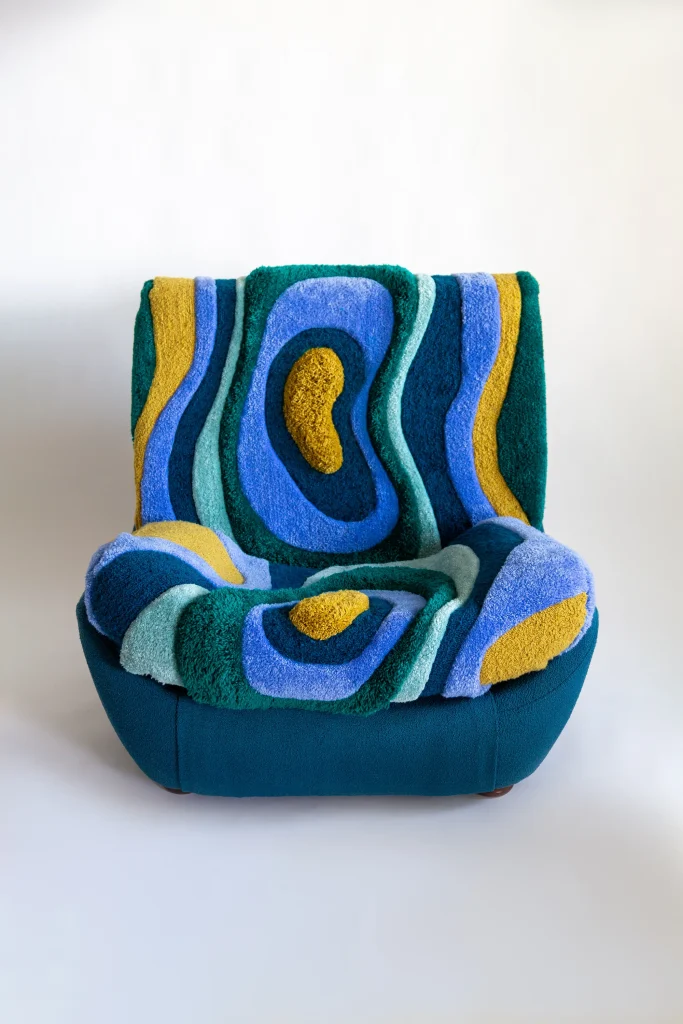 The Atlantis armchair, handmade at the Silesian Furniture Factory in Świebodzin, Poland, combines comfort with artistic flair. Its hand-tufted, multicolored wool upholstery makes each piece a one-of-a-kind creation, rich in texture and personality. Compact yet bold, it perfectly embodies the expressive energy of maximalist chairs.