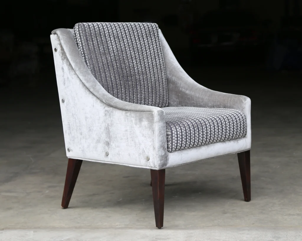 This elegant lounge chair features gently sloping arms, polished steel button detailing, and ebonized Argentine rosewood legs. Its refined silhouette and contrasting fabrics highlight timeless craftsmanship, while customizable upholstery options allow for a personalized touch—an enduring piece that complements both modern and mid-century modern interiors.