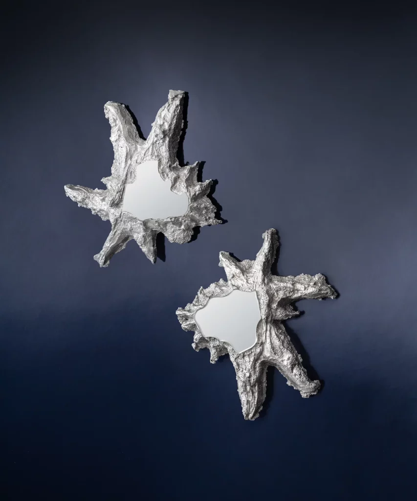 Like a phoenix rising from the ashes, these small decorative wall mirrors evoke cycles of transformation and renewal. Cast in aluminum, they channel a radical, maximalist spiritโsculptural, expressive, and boldโbringing a distinctive, almost celestial presence to contemporary wall mirrors and interiors driven by statement design.