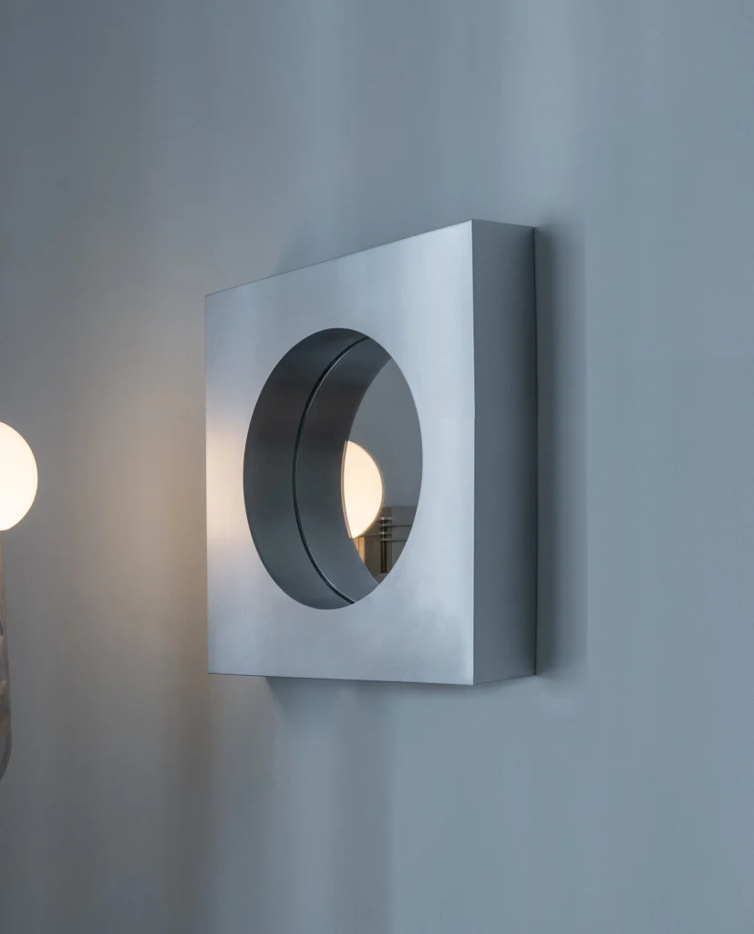 Spegla is a mirror and lamp combined into a single, transformative object. Using semi-transparent mirror glass, it shifts seamlessly between reflection and illumination as the light is dimmedโappearing as a wall mirror when off, and glowing softly when lit. As the light increases, the mirror effect fades and the matte edge begins to glow, creating a subtle golden halo. Water-cut in Sweden, the glass diffuses light gently toward the front while casting a stronger glow behind, enhancing walls without glare in a way that echoes contemporary wall lamps and sculptural lighting approaches explored in wall lighting.