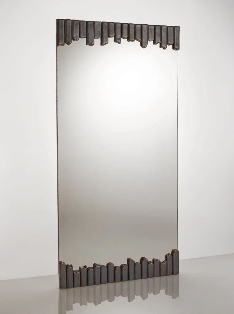 Frozen Cliff is a sculptural wall mirror defined by handcrafted ceramic tiles finished in a semi-matte metallic glaze. Textured borders at the top and bottom create a rhythmic, architectural presence that feels both bold and refined. Designed as a statement piece, it appeals to collectors and design lovers drawn to material-driven craftsmanship.