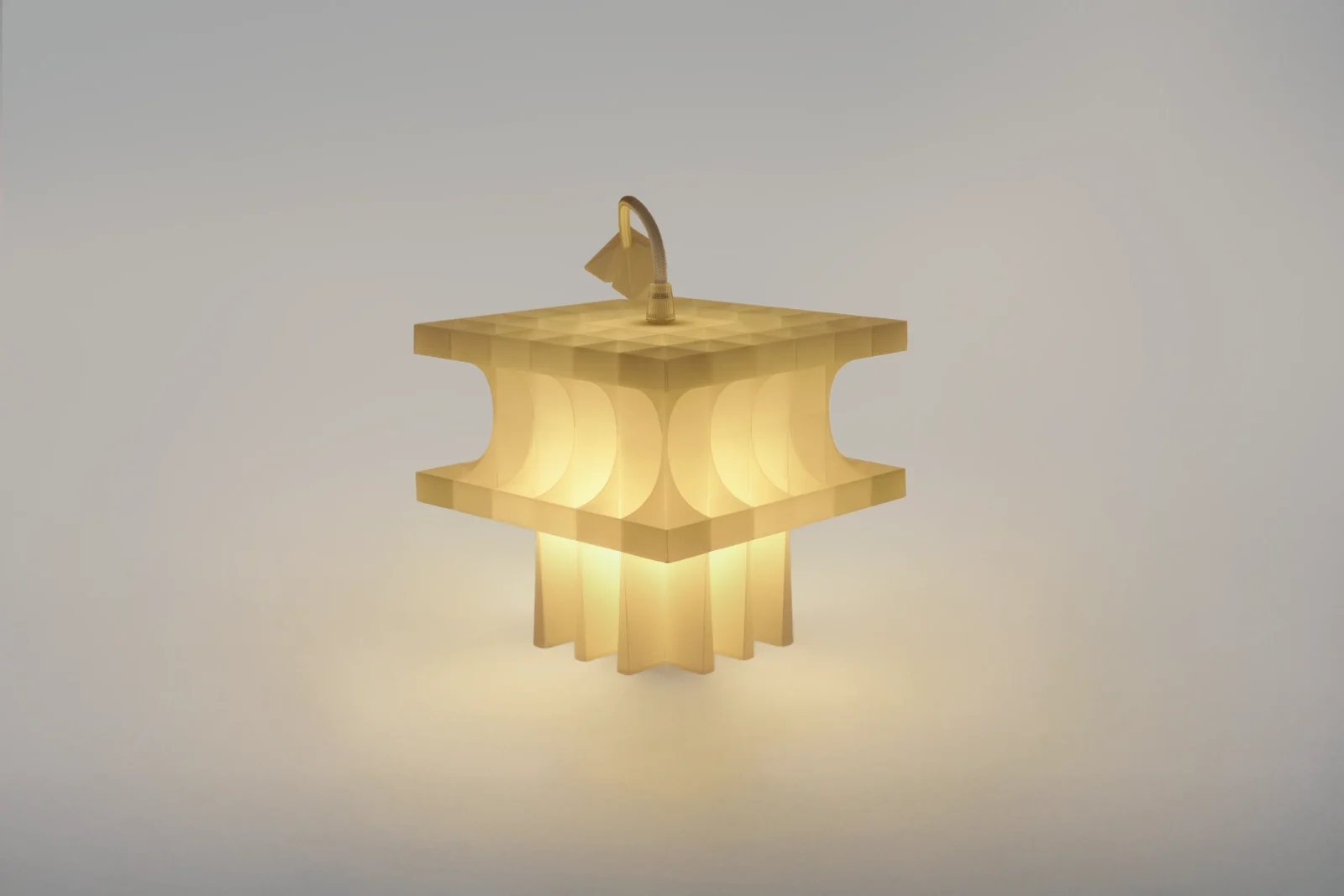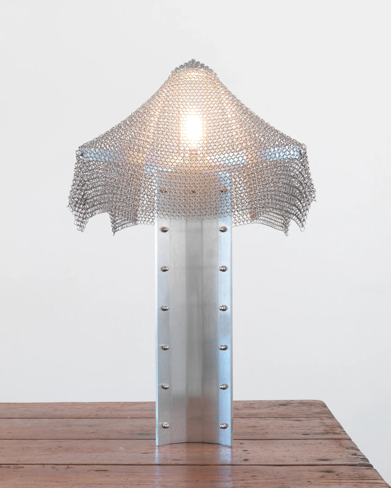The Athina table lamp is a contemporary ode to the classical column, reinterpreted as a hollow, folded metal form. Crafted from bespoke sheets joined with industrial precision, it transforms architectural strength into delicate illumination—a timeless expression of metal design.