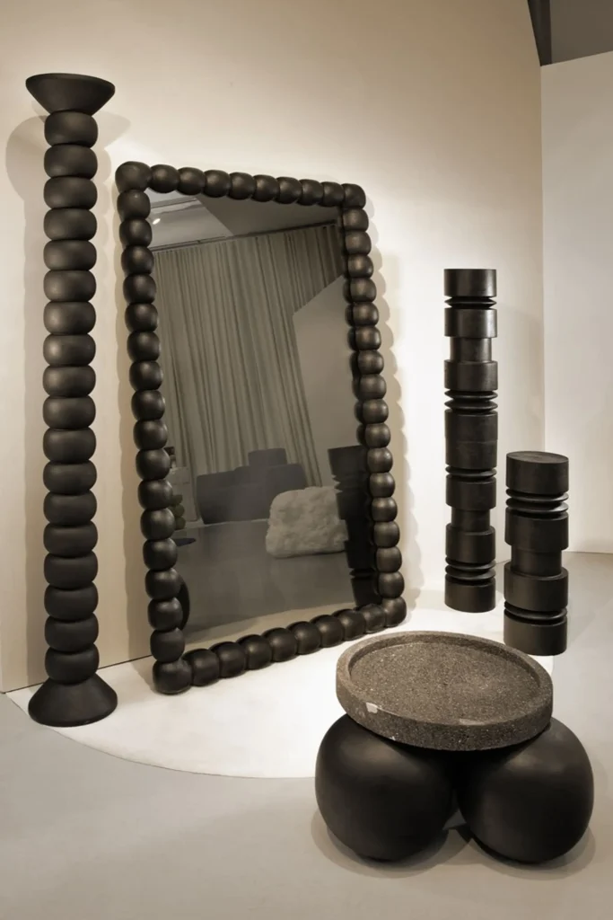 Crafted from Yucatรกnโs national cedar wood, the FOS Smoke Mirror by Daniel Orozco Estudio is shaped through artisanal turning and woodworking techniques. Its frame is detailed with carved half-spheres and finished with a burnt treatment, paired with a smoked mirror for depth and character. Freestanding and sculptural, it stands as one of the studioโs most iconic expressions of craftsmanship.