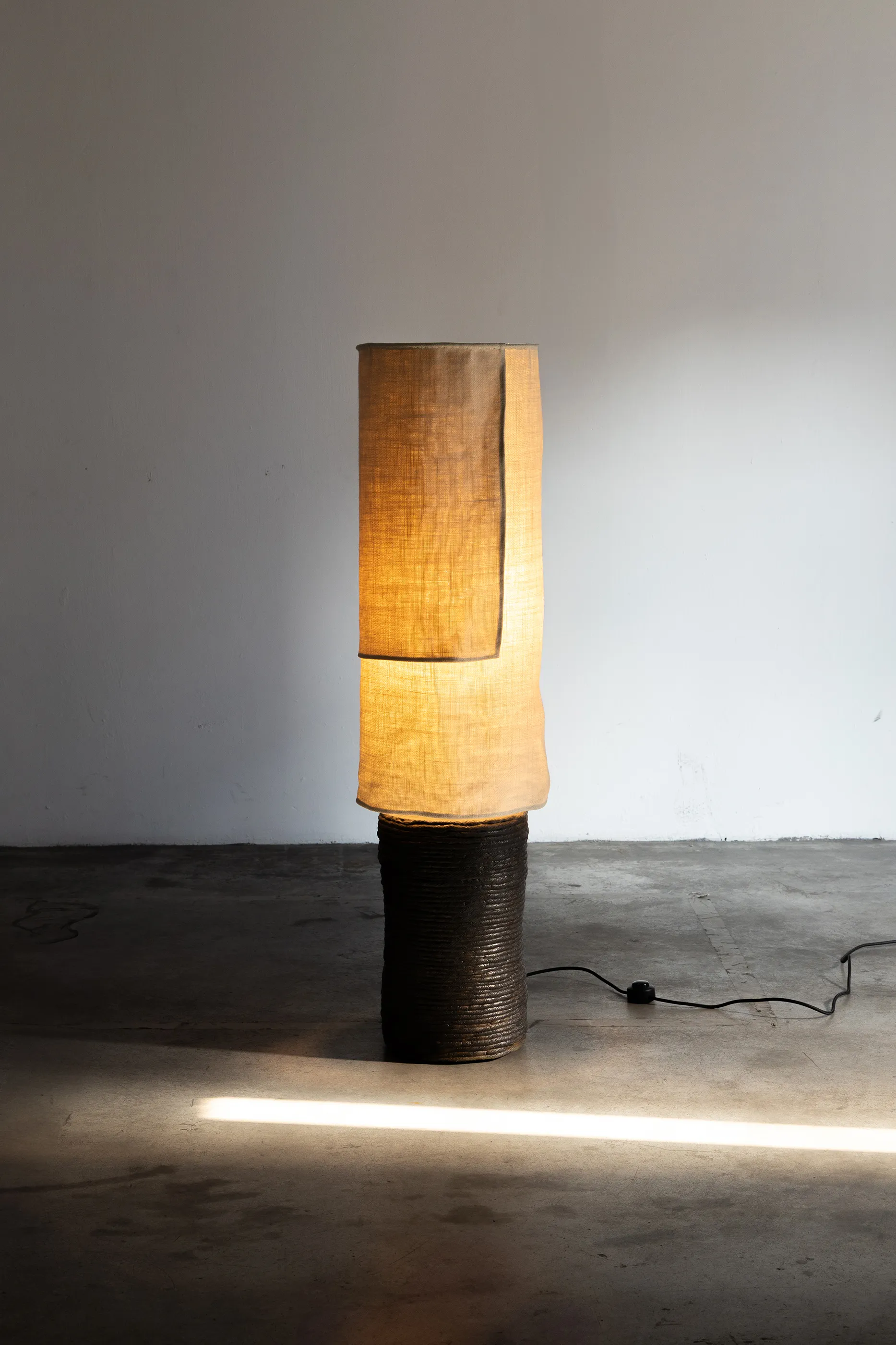Suspended between earth and sky, Nova captures the essence of a Mediterranean horizon—a glowing halo crowned with paper and anchored in clay.With its square, architectural base and its delicate paper ring, Nova evokes the silhouette of an ancient tower shimmering under the midday sun. By day, its sculptural presence anchors the space; by night, it diffuses a warm, celestial glow—like light filtered through a cloud, recalling the timeless elegance of Art Deco lighting.