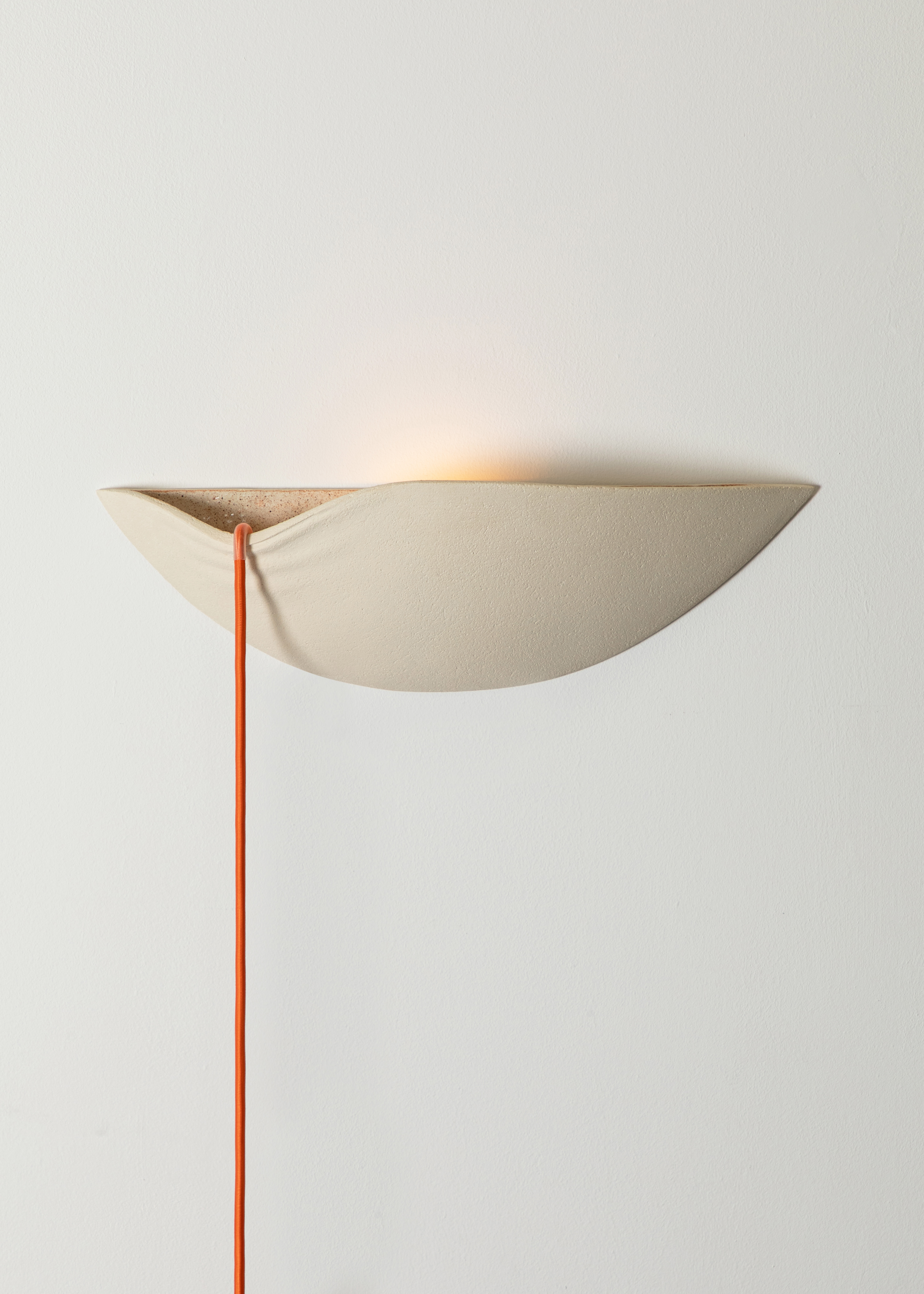 Two chamotte sandstone elements merge through curved lines, creating a delicate shape that brings a soothing presence to the wall. Handmade in the studio’s workshops, this piece demonstrates how simple forms generate substantial visual impact. The curves direct light both upward and outward, softly illuminating the surrounding wall surface.
