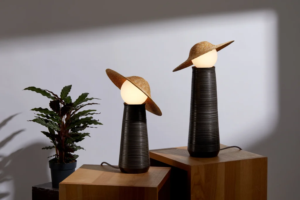 Dark brown stoneware replaces the original marble in this collaboration between Aristotelis Barakos and ceramicist Giannis Zois, with hand-engraved horizontal rings circling the glazed body. An opalina glass globe tops the tall, slender form, while a handwoven straw hat adds a playful Mediterranean touch. Each table lamp is entirely handmade in Athens, where the engraving process creates a tactile rhythm and allows light to dance gently across the ceramic surface.