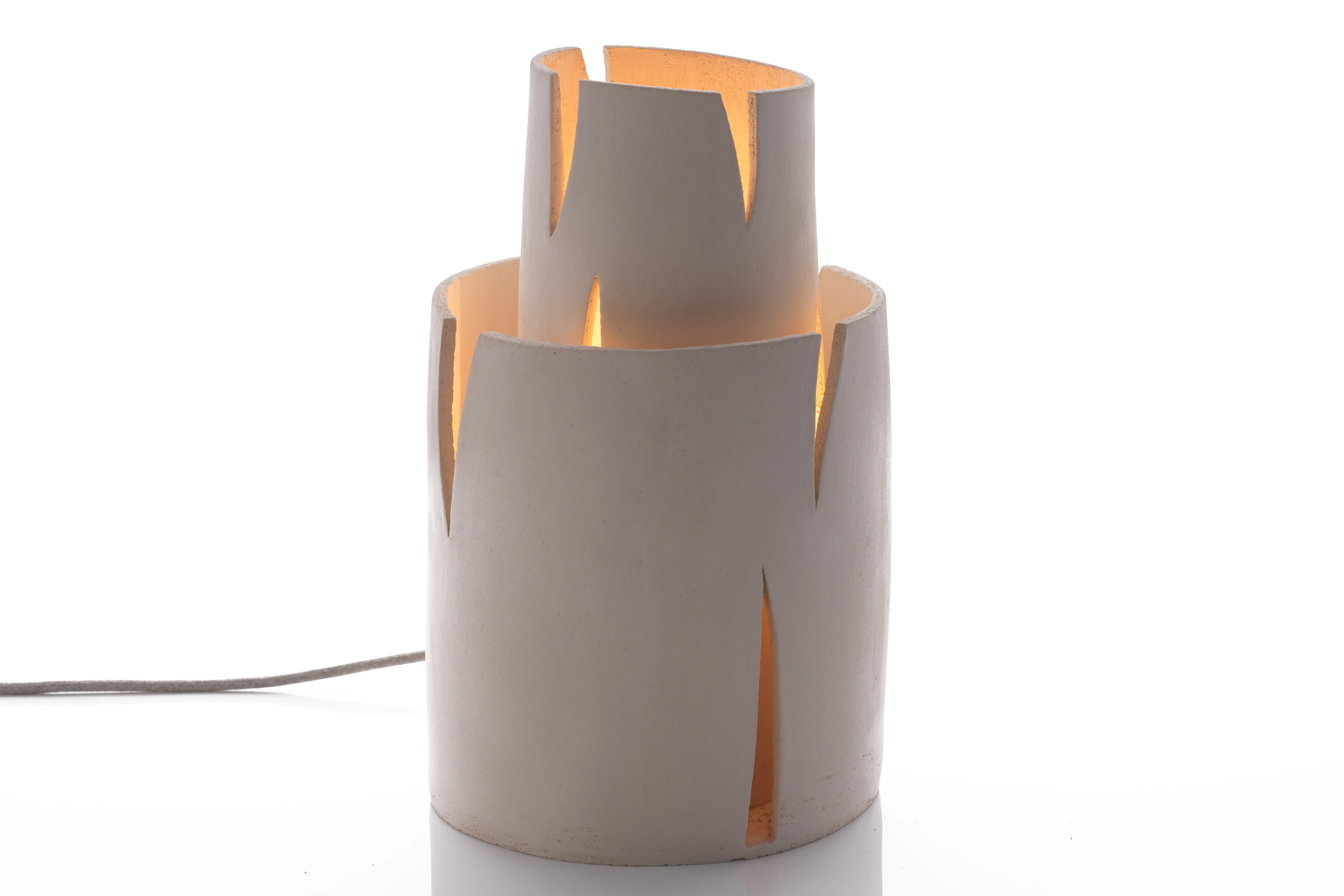 Raw clay forms a sculptural monolith during daylight hours, then reveals its dual nature at night when a bright halo emerges from within. The warm, diffused illumination recalls the first light of a Mediterranean sunrise, with the unglazed surface showing the material in its most elemental state. The piece exists equally as sculpture and light source.