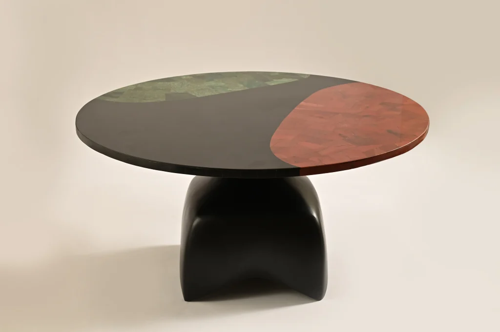 The Warrior Neckless Table closes the Wool Diaries collection with a shift in material and tone. Instead of felt, it draws from the shapes and proportions of jewelry. Reclaimed oak and Georgian tuff stone form a clean, geometric composition that feels both grounded and refined. The table carries forward the collection’s interest in material expression, translating the softness of earlier pieces into a solid, sculptural presence.