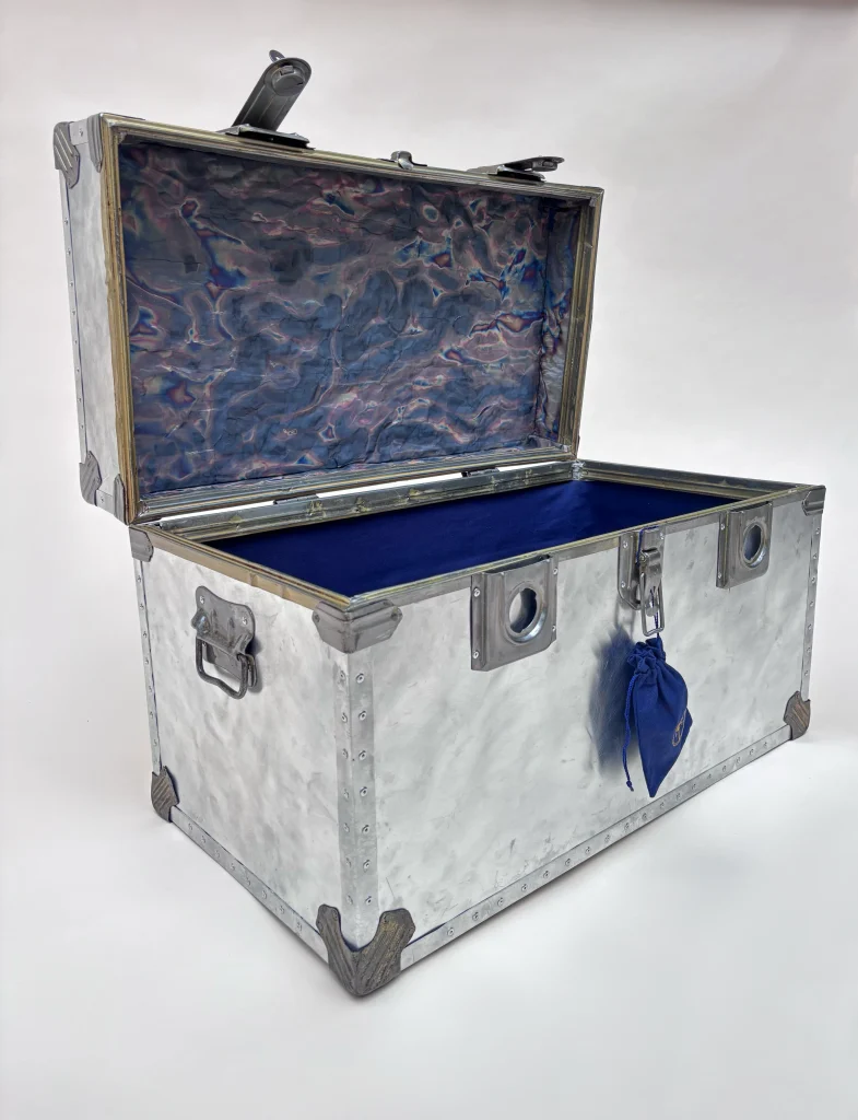The Trunk Table reinterprets the classic travel trunk as a compact coffee table, bedside table, or bench. Built from lightweight birch panels clad in aluminum, it carries the look of a true travel case with salvaged hinges and hardware from an old family trunk. Inside, embroidered upholstery and heat-treated steel mesh introduce quiet references to the designer’s time in Gabon. Layered compartments, including a concealed false bottom, offer thoughtful storage. It functions as both furniture and a small, personal archive.
