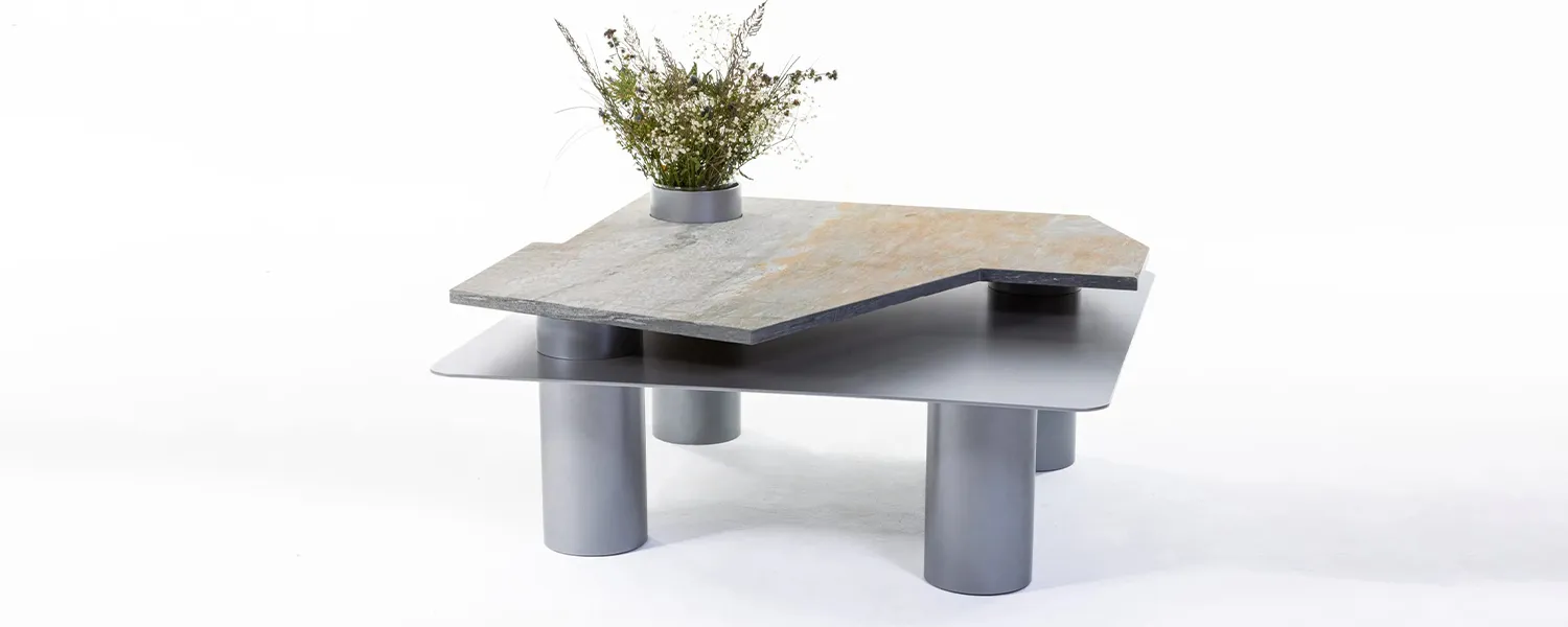 The Camber collection by Paul Coenen began with a simple question, how far a single sheet of stainless steel can go. A flat rectangle is cut, machine-folded three times along its length, then finished by hand as the legs are bent into their final angle. The result is a sleek, brutalist coffee table shaped through precision and a restrained use of material.