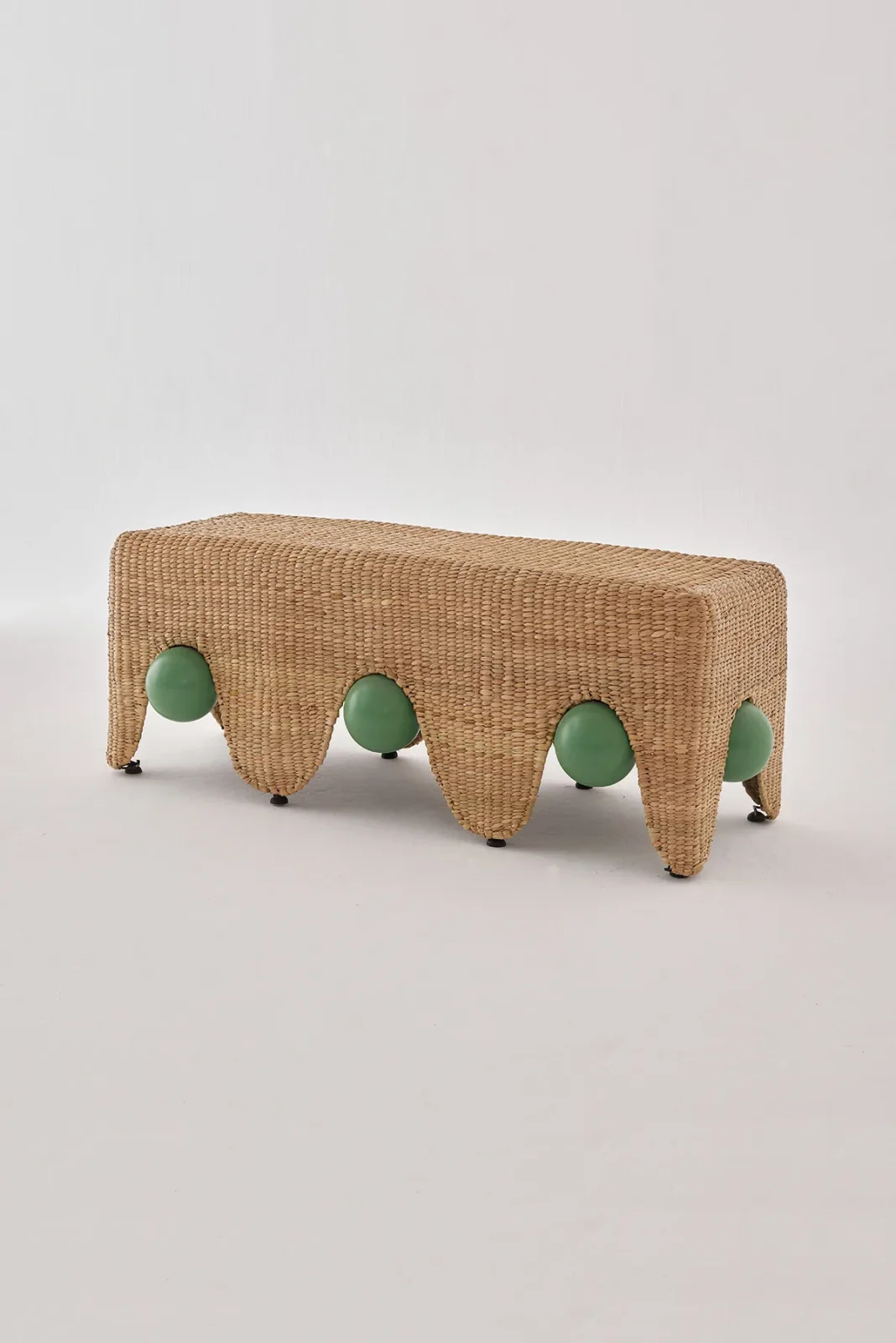 The Jolgorio bench goes beyond conventional design, woven from natural materials and accented with colorful lacquered wood. It brings a textured, vibrant energy accentuated with maximalist touches, abandoning the constraints of serious and everyday design in favor of a more whimsical style.