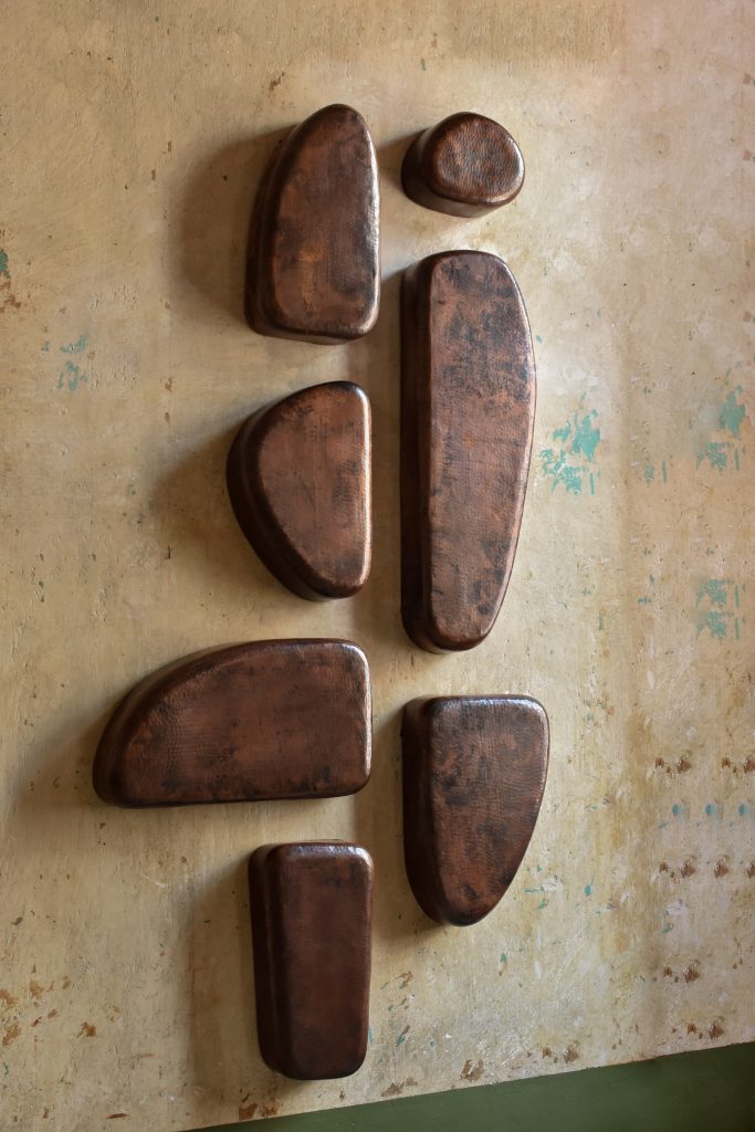 This set of seven sculptural wall pieces is handcrafted in hand-hammered copper, each one shaped and finished individually by artisans in Michoacรกn, Mexico. The semi-oxidized patina is created through fire and acid treatments, giving every form its own distinct coloration and texture. Made from upcycled copper sourced from local goldsmith workshops, the collection blends sustainable craft with striking, organic dimensionโeach piece a unique work of art.