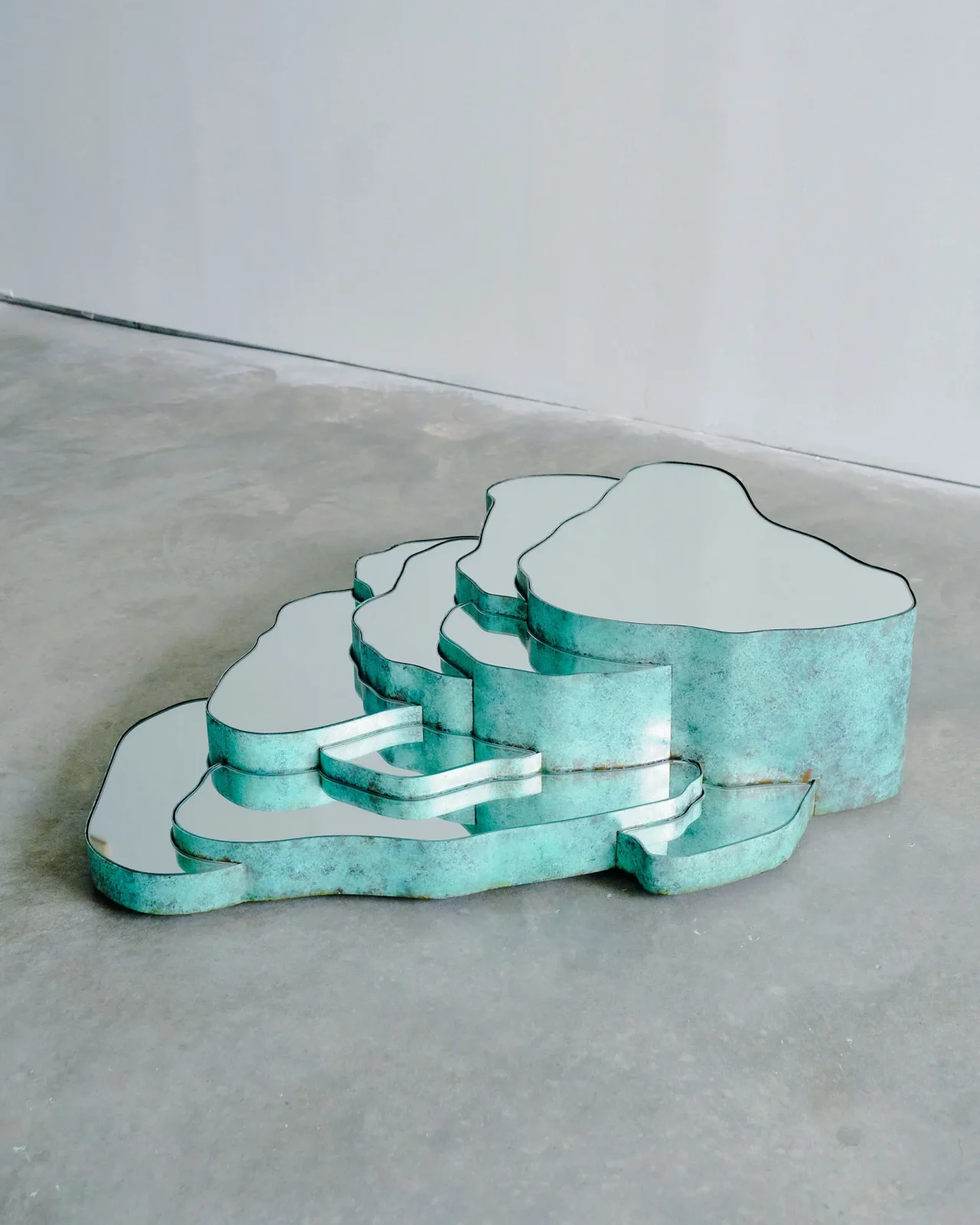 Inspired by terraced landscapes where human intervention meets natural topography, this mirror translates geological forms into a sculptural wall piece. Its surface appears to drip downward, projecting a sense of layered terrain onto a planar reflection and aligning with expressive 3D wall art. As you move around it, the mirror shiftsโoffering a complete reflection from the front, then fragmenting it into scattered glimpses edged in brass, turning perception into a spatial, ever-changing experience rooted in contemporary wall mirror design and ideas found in optical illusions.