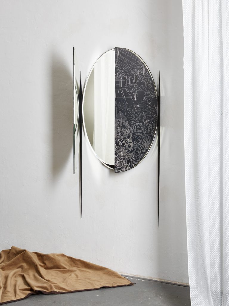 This mirror reinterprets the historical triptych form, featuring engraved scenes of a greenhouse and organic floral motifs. The detailed imagery reflects the symbiotic relationship between nature and humanity, aligning with biophilic design and blending narrative ornament with a timeless, architectural silhouette found in contemporary wall mirrors.