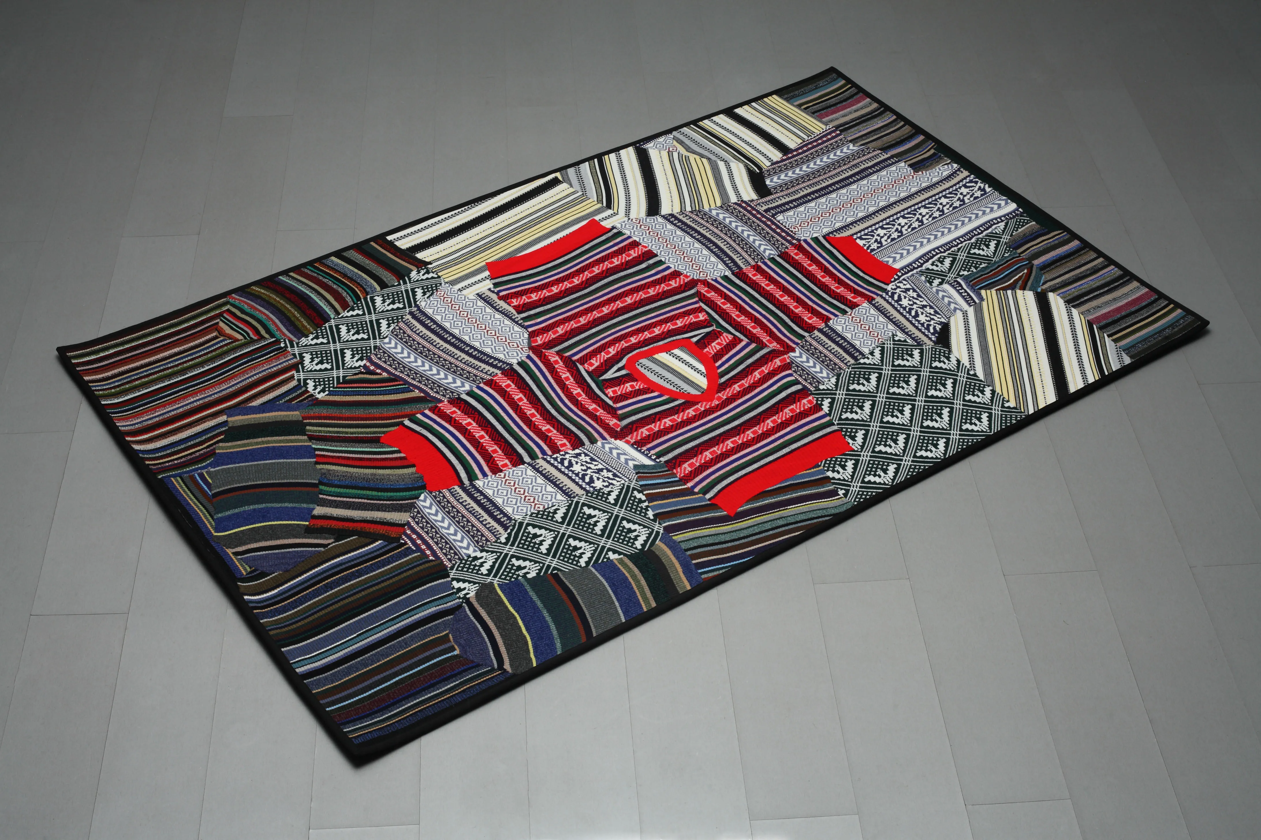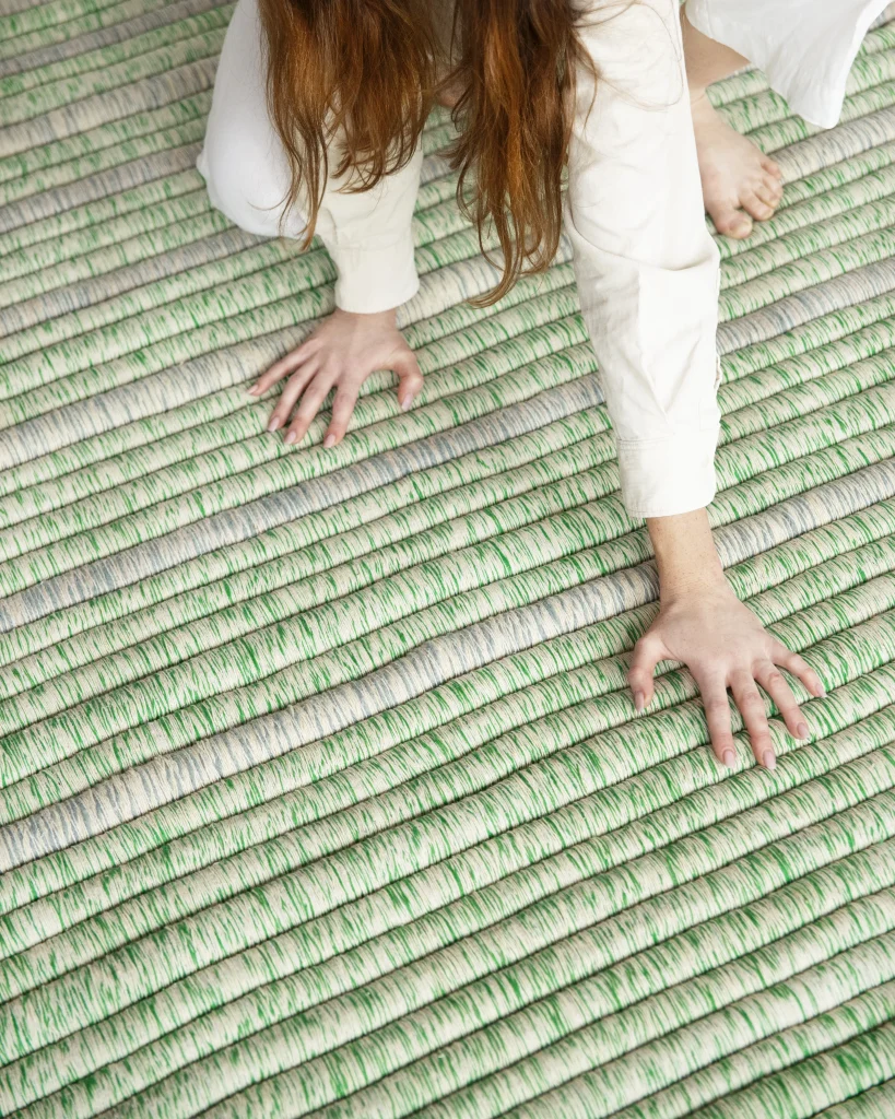 The Repeated carpet collection is made from reclaimed knitwear, including sweaters, scarves, and gloves, reworked into rugs defined by rhythmic, repeated patterns. Produced on industrial looms in Lithuania, each piece follows the same process yet varies in color and composition based on the sourced textiles. The option to use personal garments adds another layer, allowing familiar materials to take on a new, functional form within the home.