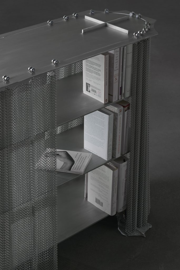 Part of the “Slipcover” collection, this small bookshelf combines brushed aluminum and limed oak in a Gothic aesthetic that celebrates readers’ furniture. The design allows book titles to be read from all angles, creating an interactive relationship between user and storage. Its stark structure and rich materials legitimize the reading experience, providing sophisticated storage for literary collections.