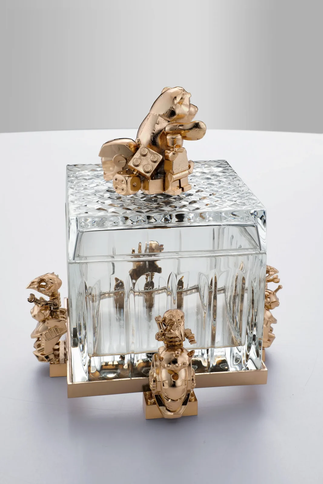 Taking a hard left from the maximalist kids’ table, we dive into dark opulence. Blackened brass and hand-carved wood anchor the scene, while jewel-encrusted goblets catch light against smoky crystal carafes. This is dining at its most theatrical. The verdigris candleholder looms like ancient sculpture pulled from the depths, its solemn tubes casting shadows across nail-inspired cutlery and raw-edged ceramics. Volcanic glass coils through copper wire, and rubble turns to art – each piece holding traces of its own destruction and renewal. The mix strikes a precise note between rough and refined: textured plates, gem-studded stems, and surfaces that demand touch create a setting steeped in darkness and desire.
