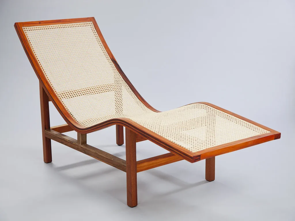 The Chaise Sossego is a unique wooden lounge chair crafted entirely from solid wood and natural cane, offering a refined blend of sculptural elegance and everyday comfort. Its fluid, organic silhouette is achieved through artisanal steam-bending techniques that shape the wood into ergonomic, body-hugging curves. Light, breathable, and exceptionally durable, this handcrafted chaise stands out as a designer wooden chair that brings warmth and authenticity to living rooms, reading corners, or verandas. A timeless invitation to pause and unwind.