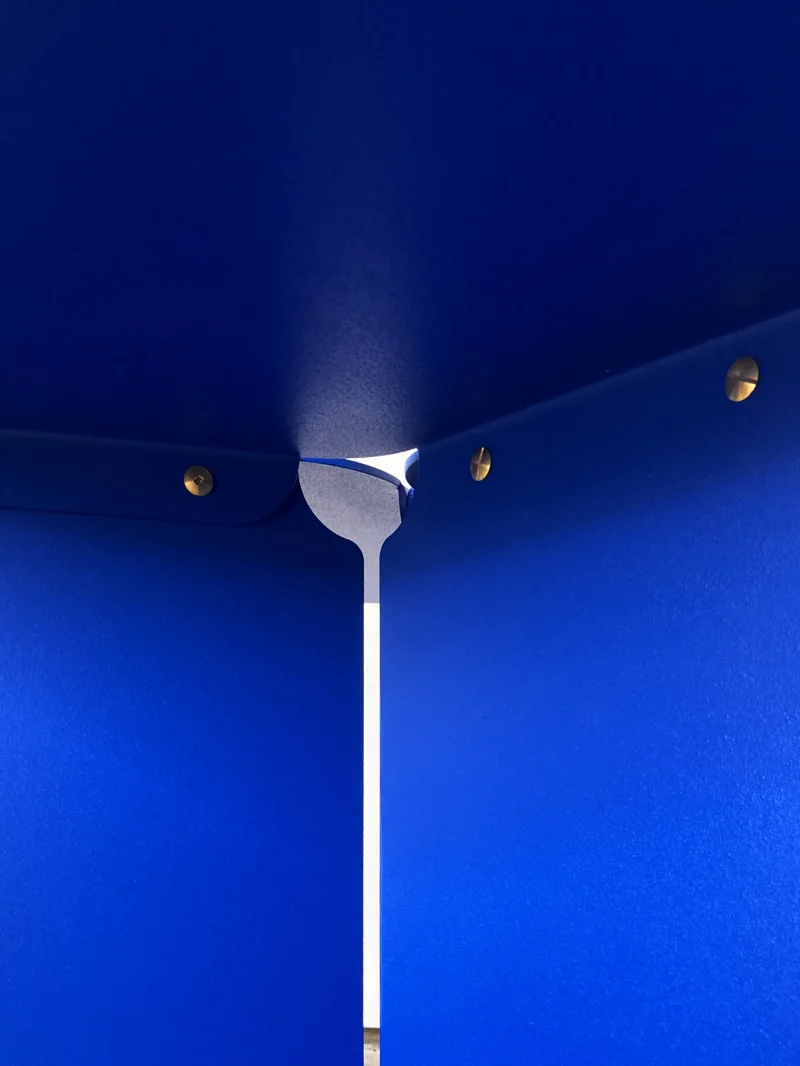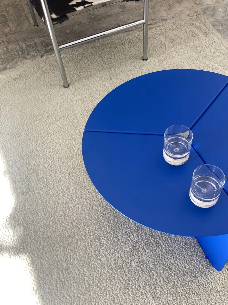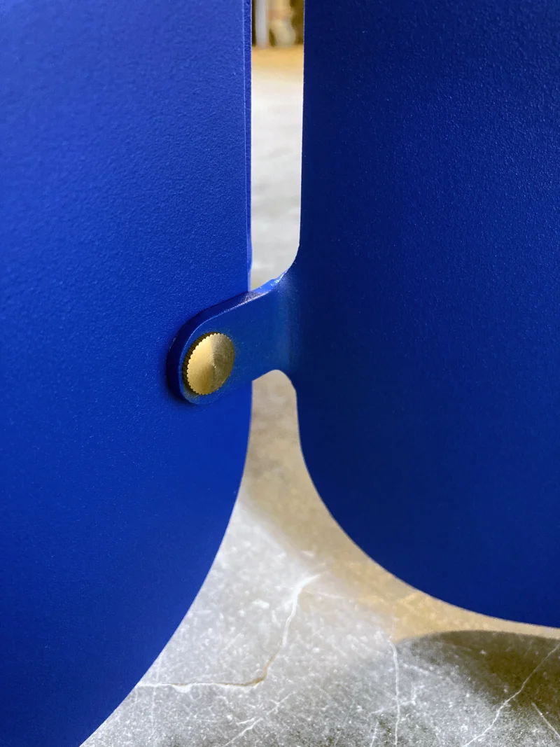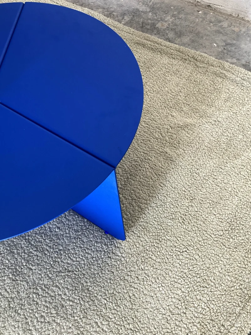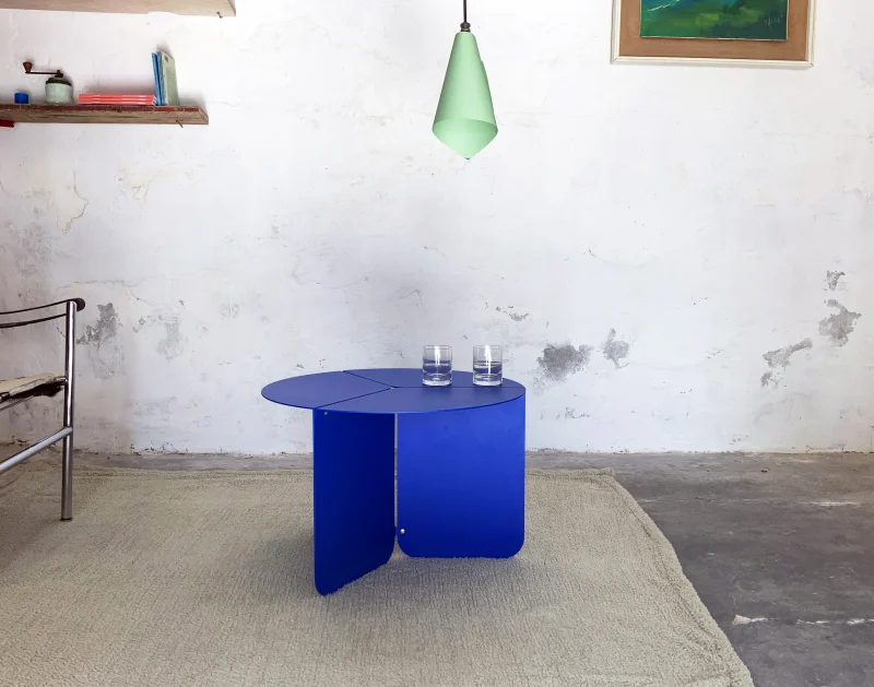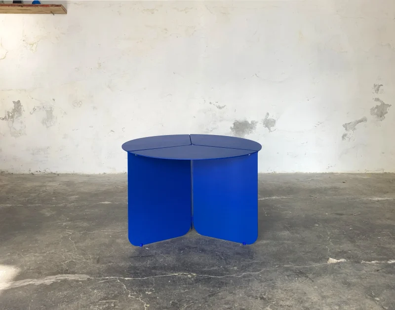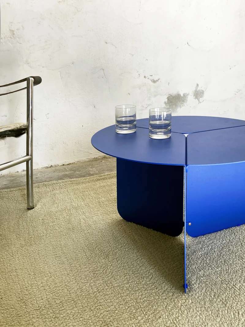 The “120” table was born from the idea of developing an object starting from a sheet of metal, folding it and assembling the laser-cut parts together. The decomposition of the circle, into three 120° elements, allows the combination of different finishes and color combinations.