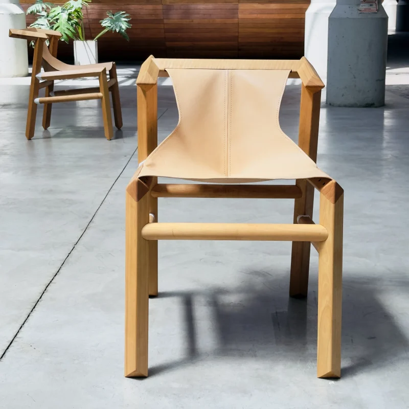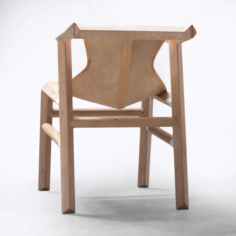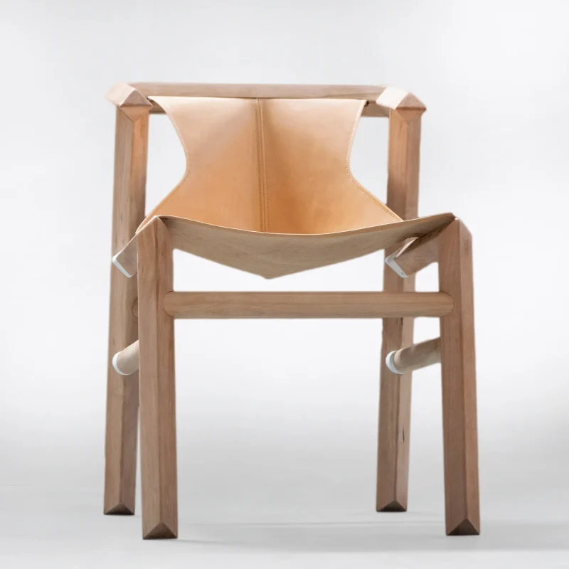 Environmentally friendly materials are chosen, like natural vegetal cognac leather, wood from sustainable forests of Patagonia and all the finishinga are based of wax – oil products, applied by hand. The chair was launched at ICFF fair in 2019 and Wanted design + ICFF 2022 during the New York design week.