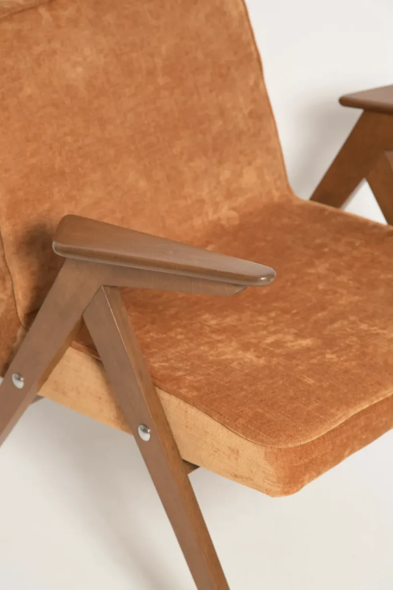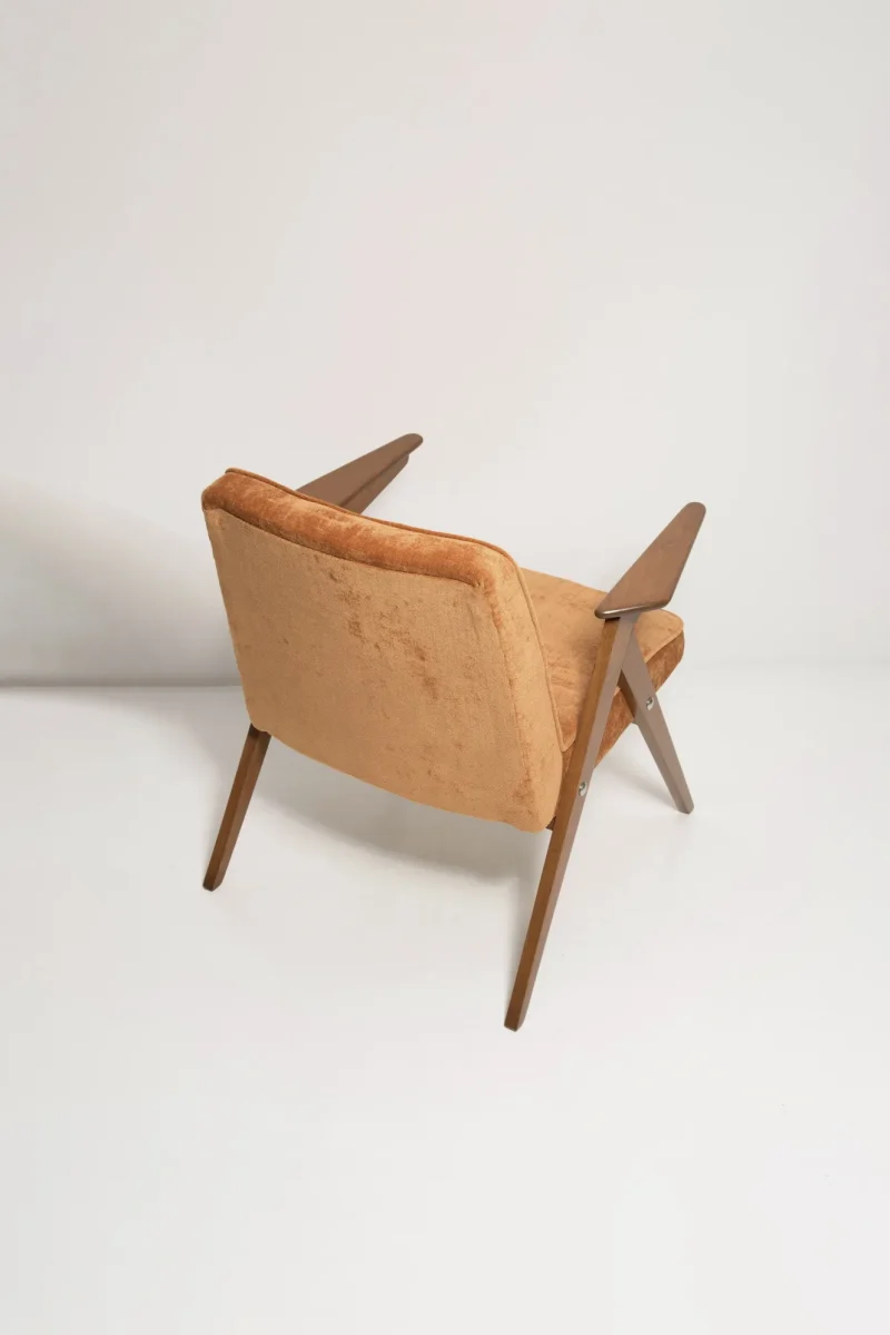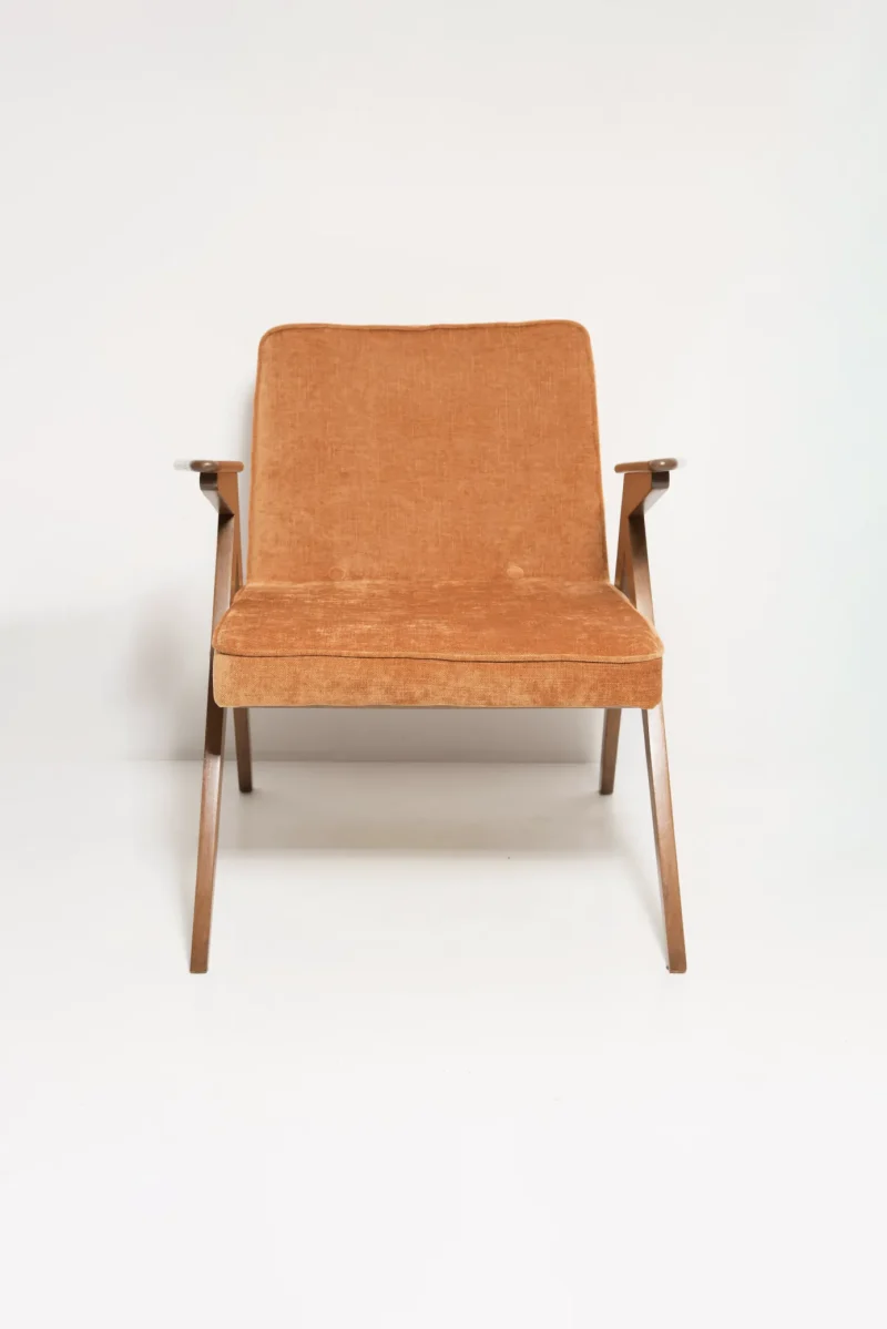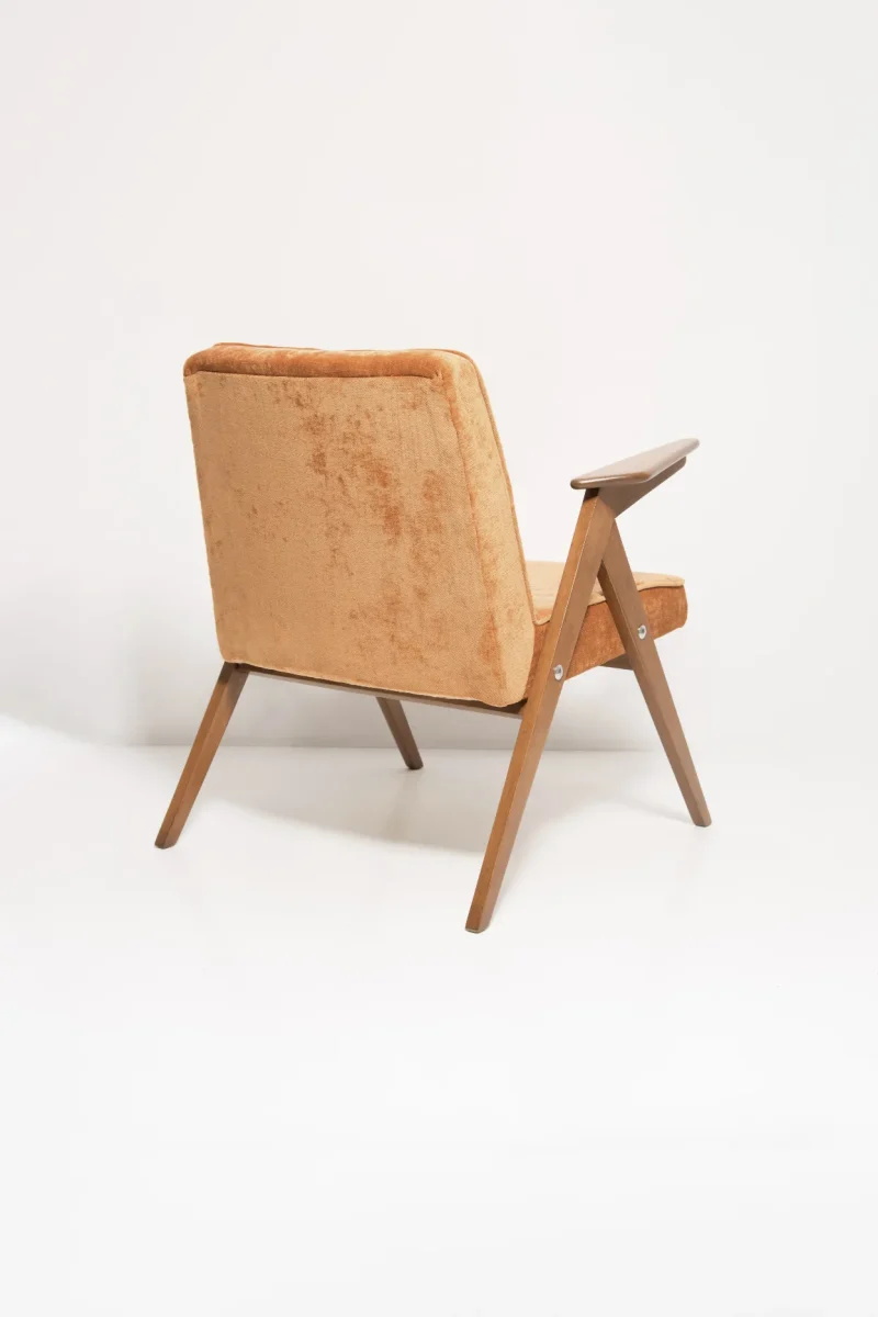 The Bunny Armchair is a celebrated icon of Polish design from the PRL period, originally crafted in 1962 by renowned interior and furniture designer Jozef Marian Chierowski. Produced at the Lower Silesian Furniture Factory in Świebodzice, this armchair exemplifies the elegant simplicity and modernist sensibilities of the era. Featuring a comfortable upholstered seat paired with a gently curved wooden backrest, its organic shape reflects the characteristic style of 1960s design. Ergonomically crafted, the Bunny Armchair prioritizes user comfort while maintaining a compact footprint, making it ideal for contemporary apartments. Professionally renovated to pristine condition, this chair can also be customized in alternative wood finishes and fabric colors, offering a perfect blend of historic charm and modern functionality.