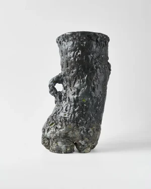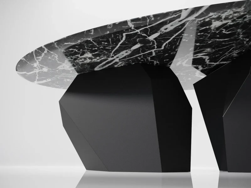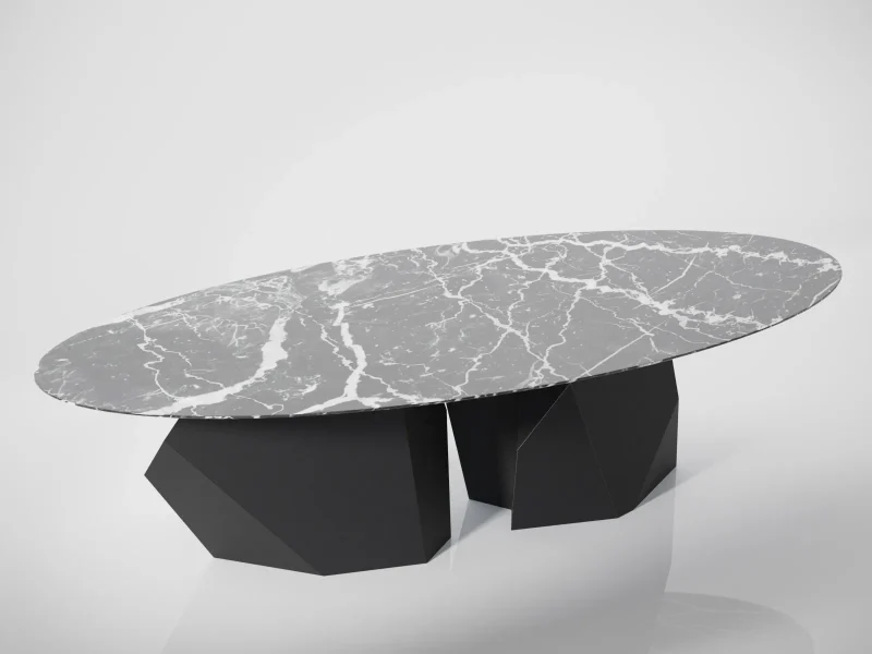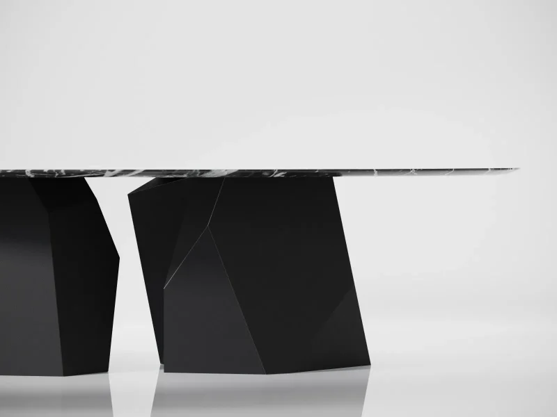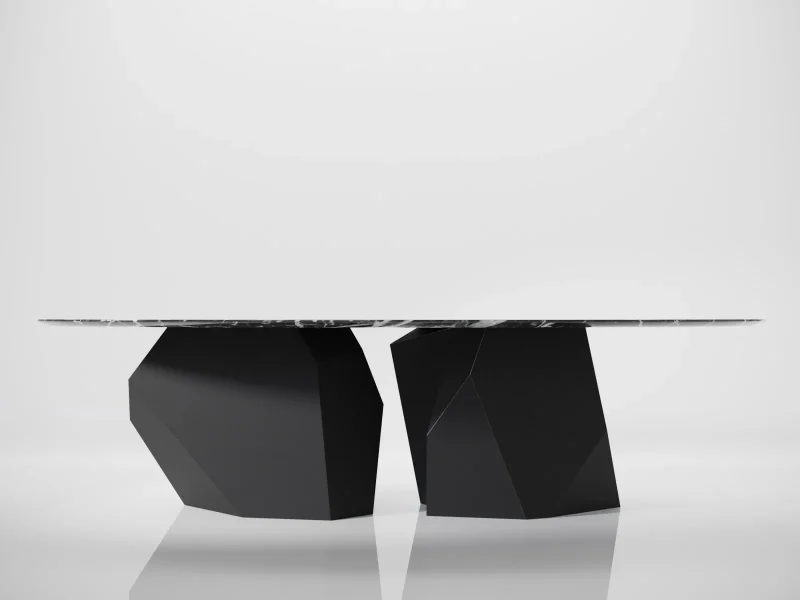 An irregular, rock-like configuration splits apart to form the base sections for this coffee table. Each structure echoes the other’s form, emphasising where they were once joined together
