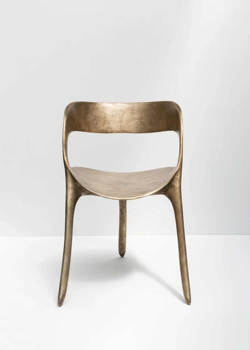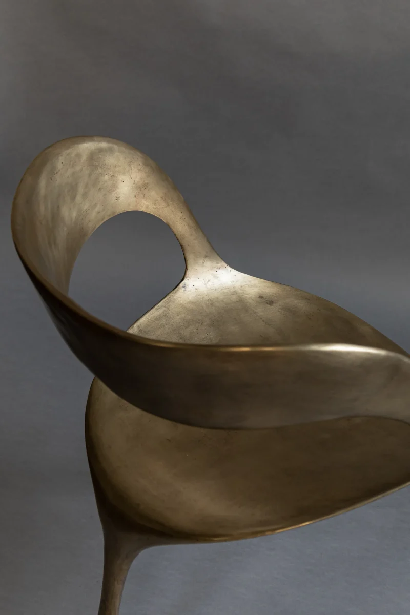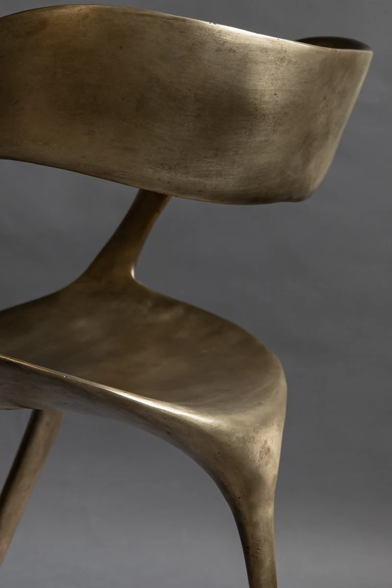 The chair, with a curved and ergonomic design, adapts to the natural contours of the body, promoting a feeling of comfort and relaxation. The legs and structure of the chair are made of cast bronze, a material that can take any desired shape, achieving a three-legged design, which within its complexity portrays the composition
