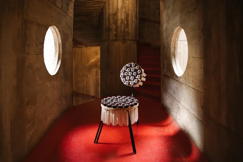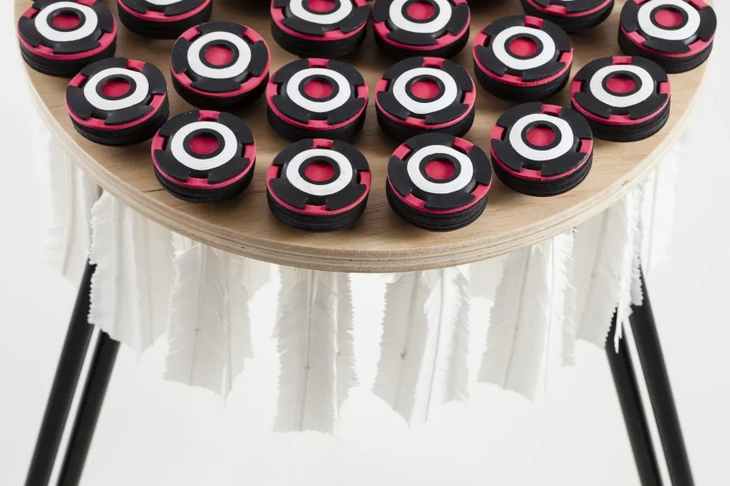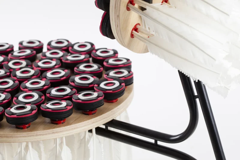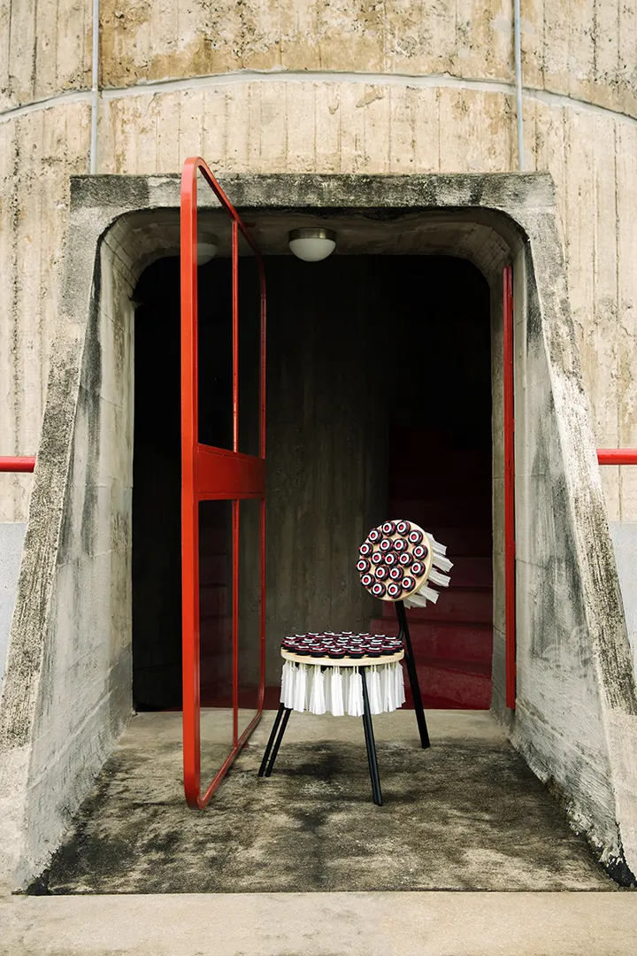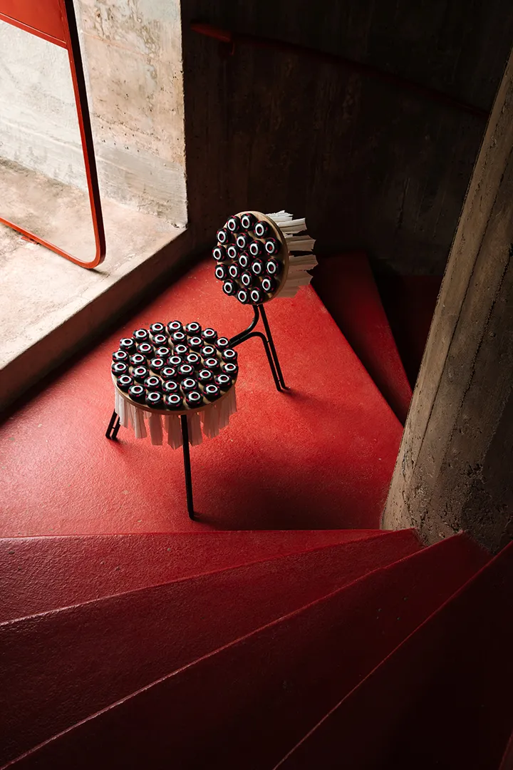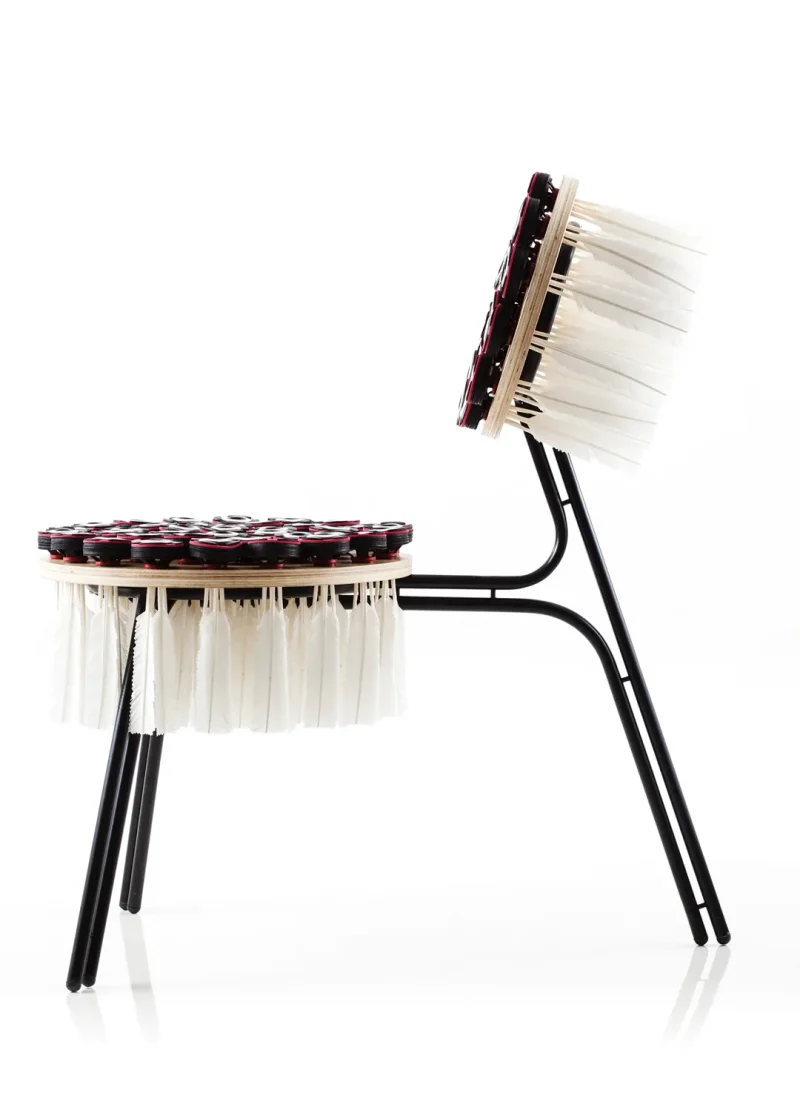 Referring to a splendid headdress, the 56 petecas that adorn the seat and back rest our ancestrality. The slim structure of the chair enhances the feathers of the peteca, while its rubberized face provides comfort.