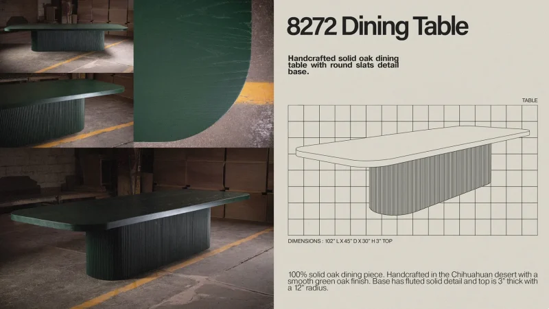 Based in Texas. Each piece is meticulously crafted by our dedicated artisans, ensuring quality and individuality. We collaborate with designers and architects to produce bespoke pieces, alongside a curated collection of over 80 designs, including dining tables, sideboards, chairs, and more.