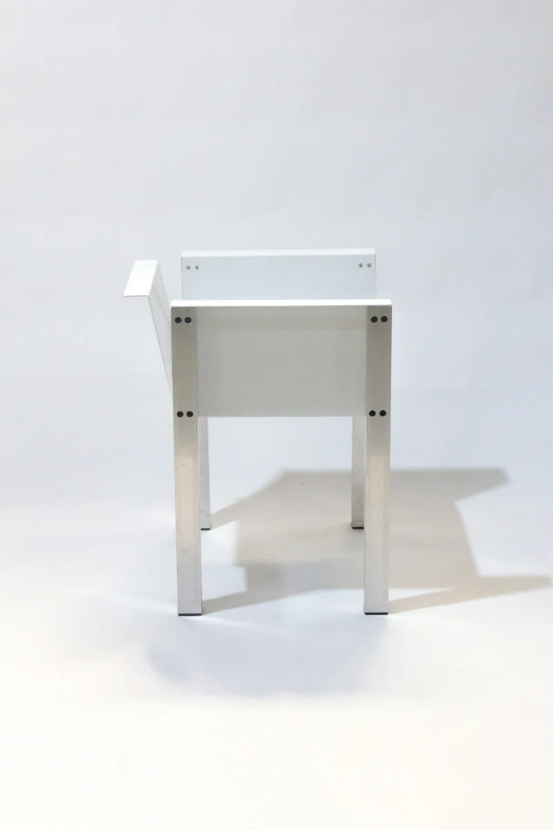 The A2 Chair by Luiz Solano is crafted from a folded aluminum sheet and four square tubular profiles with plastic tips. The sheet is laser-cut and folded such that three identical flaps structure the armrests and backrest. The support flaps are bent at a 90° angle, serving as mounts for the aluminum profiles, which are fastened with screws. The backrest flap, in turn, is bent at a 75° angle, offering comfortable body support with a slight flex.