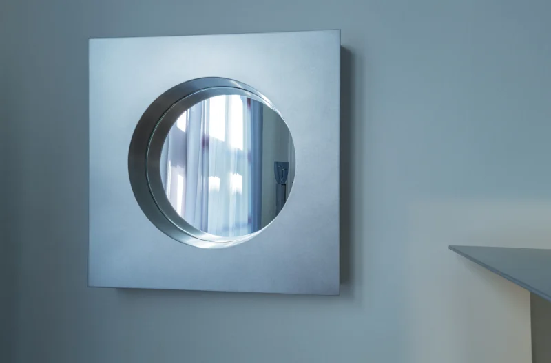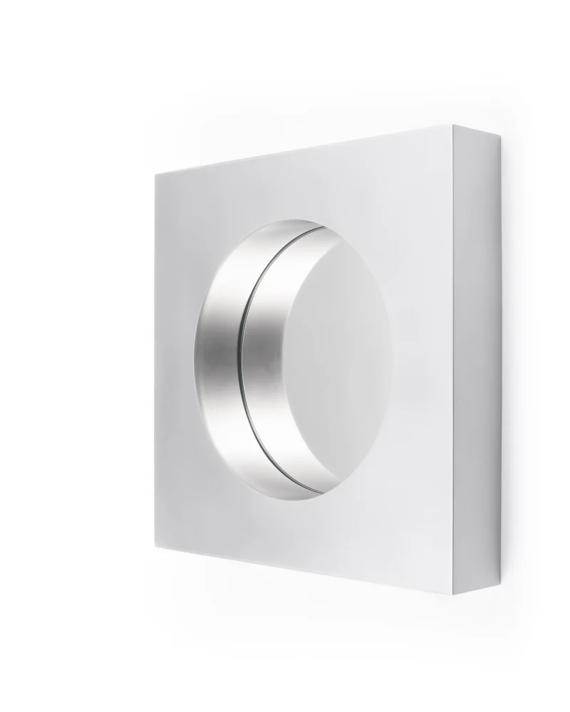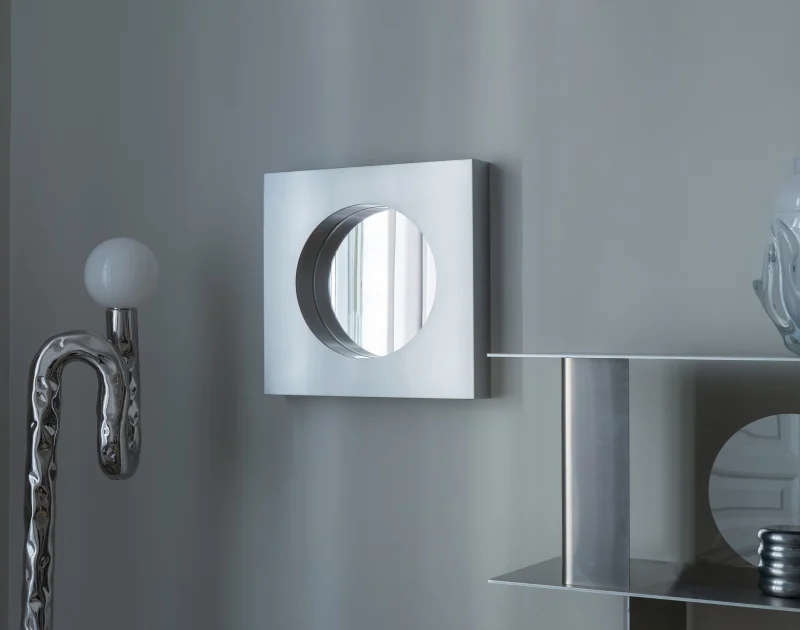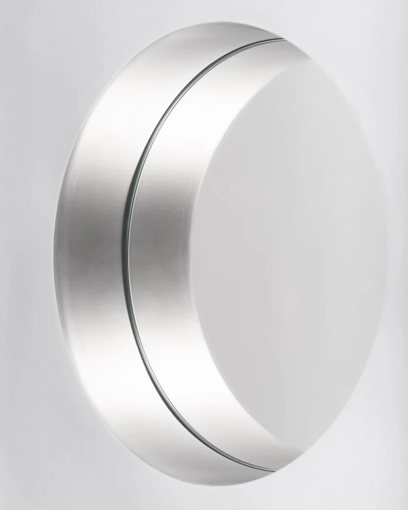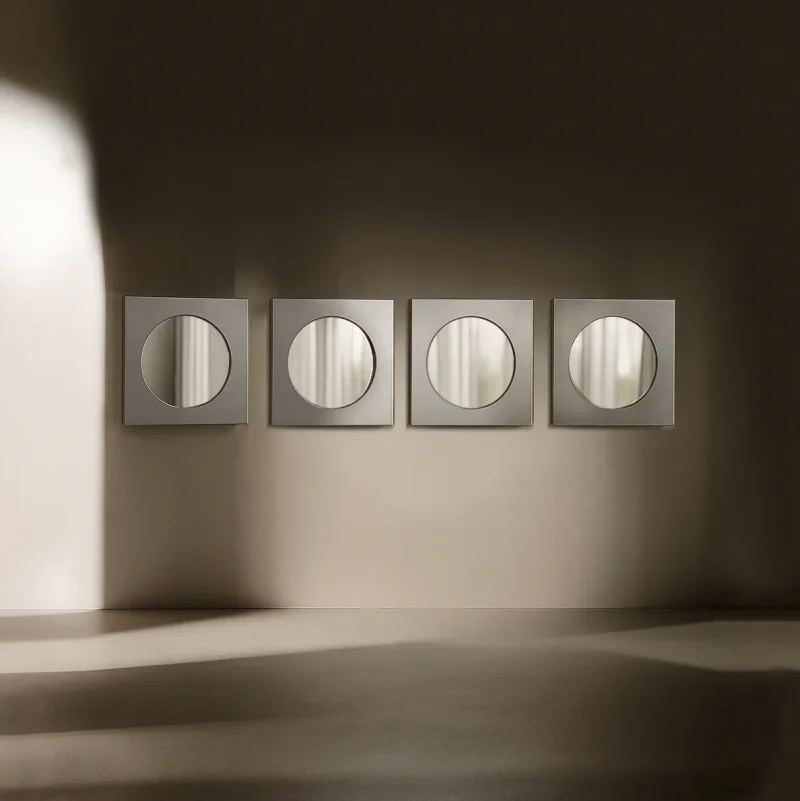 The Abbas wall mirror by Joana Teixeira is made in aluminium through the hands of different people and companies. A kind of temporary community formed around a shared goal. That collective involvement is essential in all my work, I want people to feel part of something more than just a product. The concept behind Abbas, with its depth and layered structure, reflects a need for awareness and assimilation. In fast-paced times, my work is increasingly influenced by the idea of slowing down, being present, and fostering genuine connection. While studying the space between the “before and after” of a mirror’s reflection, that cognitive moment of recognition, memory, and identity, I was reminded of Kiarostami’s 24 Frames, which explores what happens before and after a still image. That idea of a shifting present is what shaped Abbas, with its 8 cm depth representing mental processing, a frame calling us into presence and awareness. Like a new dimension.