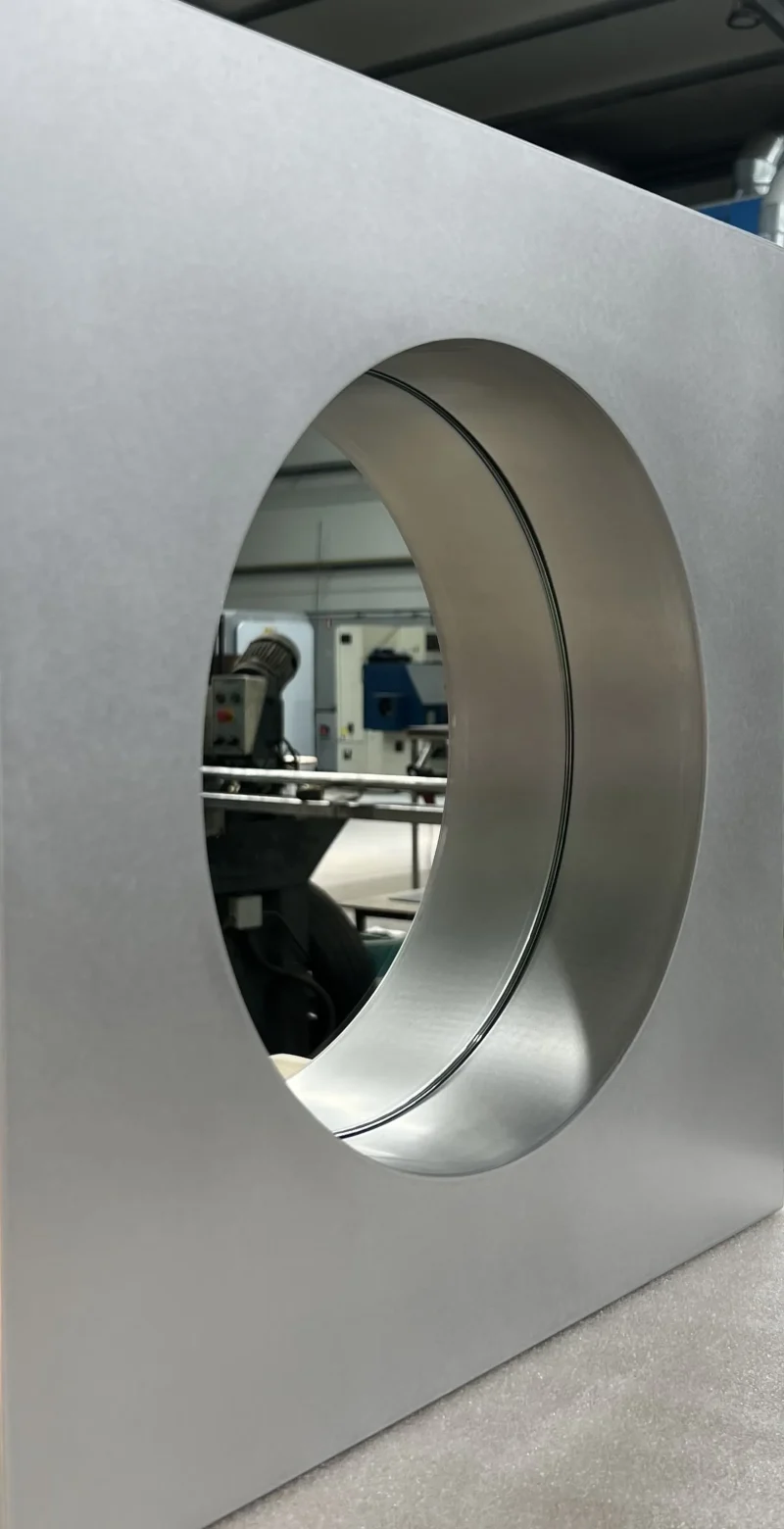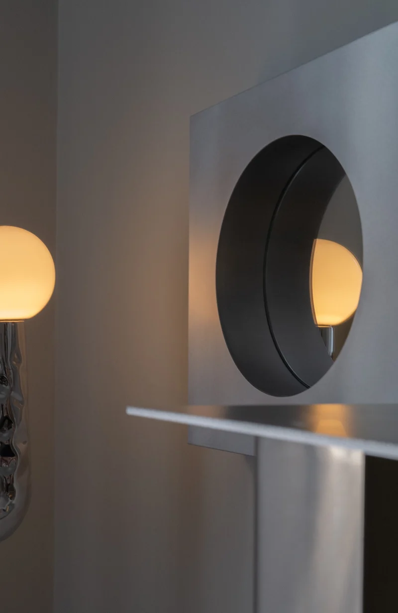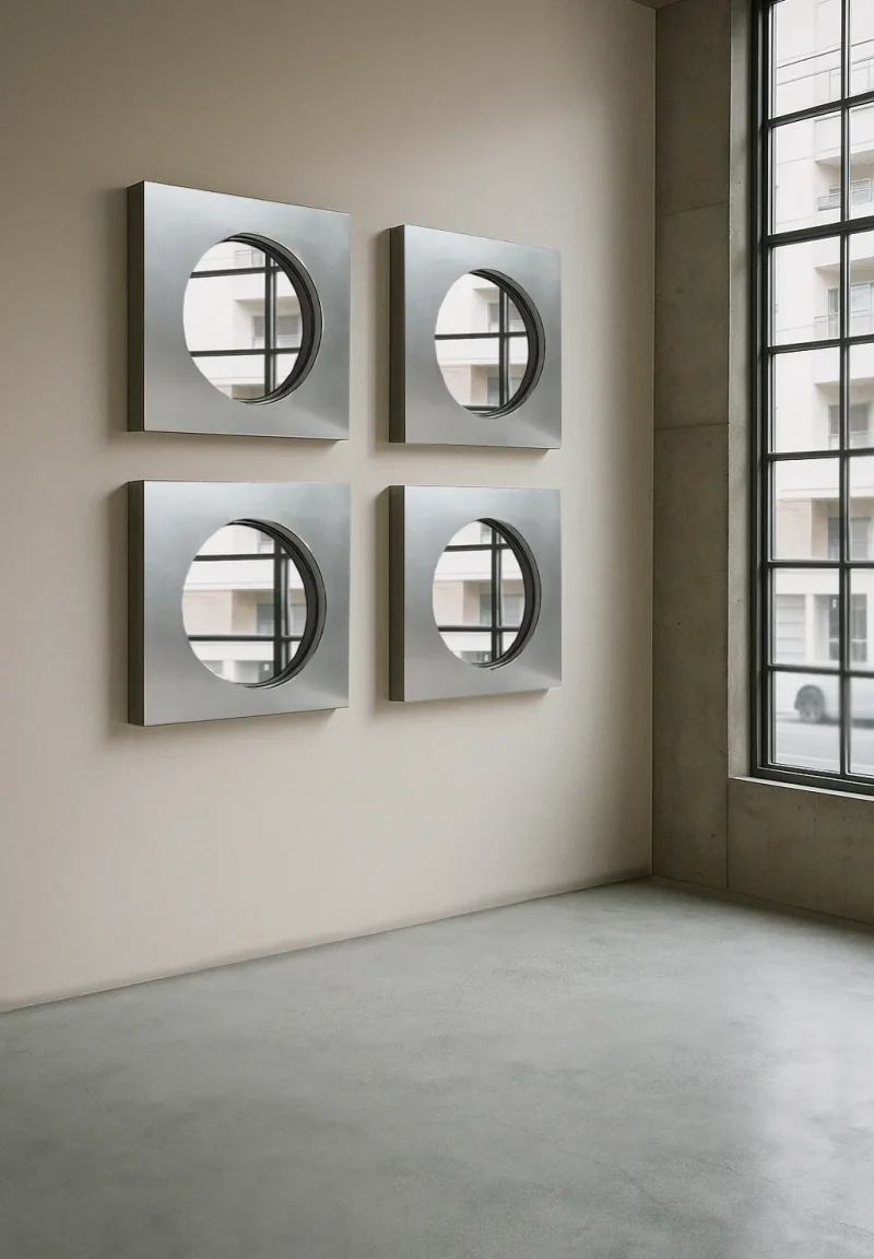 The Abbas wall mirror by Joana Teixeira is made in aluminium through the hands of different people and companies. A kind of temporary community formed around a shared goal. That collective involvement is essential in all my work, I want people to feel part of something more than just a product. The concept behind Abbas, with its depth and layered structure, reflects a need for awareness and assimilation. In fast-paced times, my work is increasingly influenced by the idea of slowing down, being present, and fostering genuine connection. While studying the space between the “before and after” of a mirror’s reflection, that cognitive moment of recognition, memory, and identity, I was reminded of Kiarostami’s 24 Frames, which explores what happens before and after a still image. That idea of a shifting present is what shaped Abbas, with its 8 cm depth representing mental processing, a frame calling us into presence and awareness. Like a new dimension.