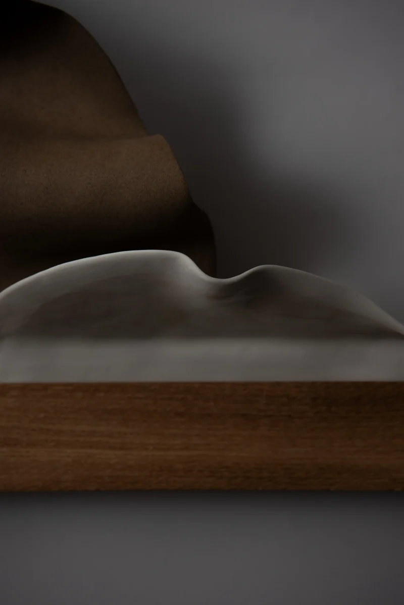 The studio's collection revolves around an exploration of patterns, such as the distinctive drape pattern of the Tenderness sconces, and of materials, with the combination of wood and ceramics in the Abundance Sculptures, that reveal the multifaceted nature of clay. Following the spiritual and movement practice of its founder, Marie-Laure Davy, the studio's creative journey has been a blend of meditation, writing, and dance which translates into the clay through gentle gestures and instinctual forms.