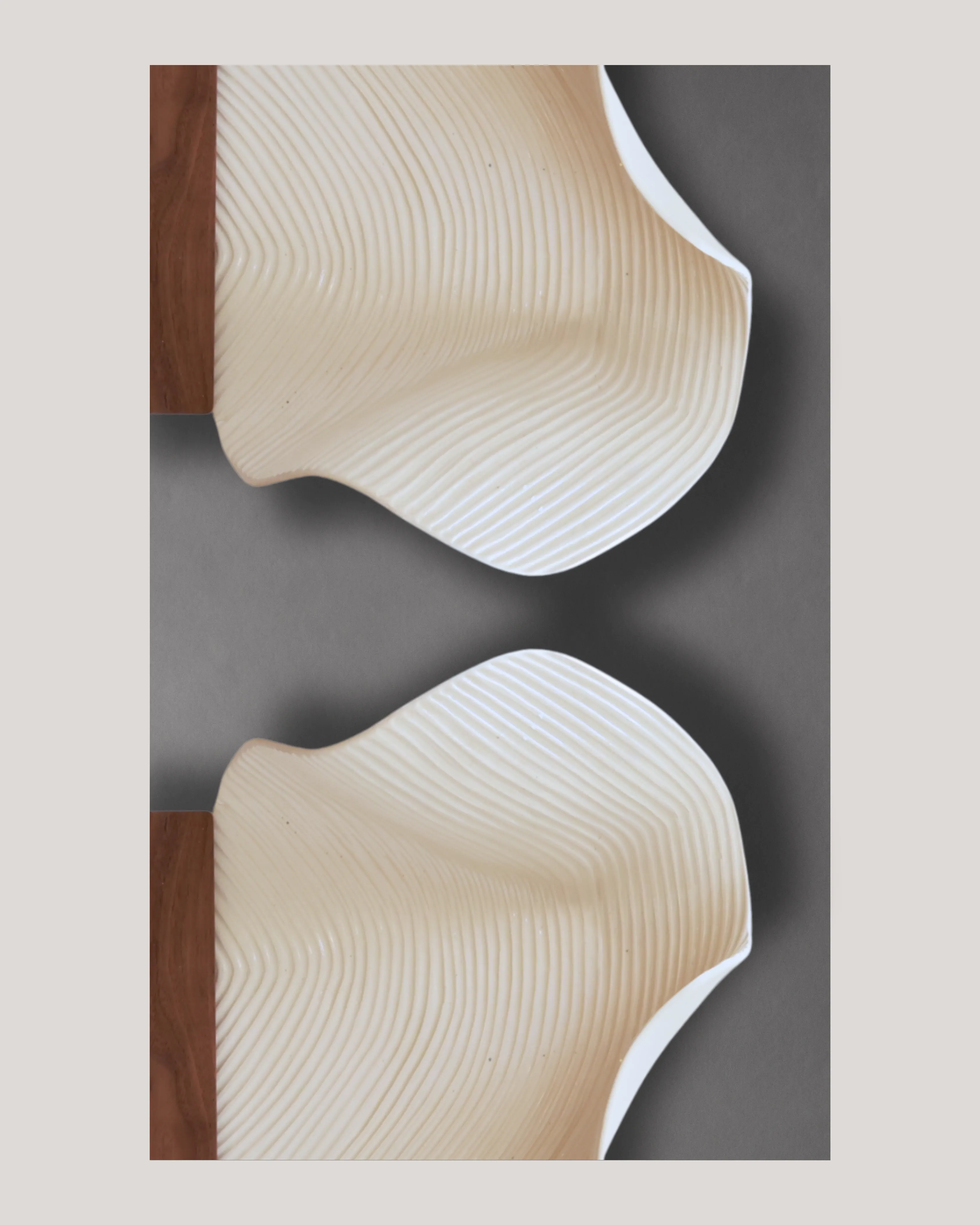 With the Abundance collection, studio ēeme has carved a path for itself – through a personal approach to wood and ceramics. In combining wood with subtle ceramic waves in particular, the studio has aimed at shaping an intimate narrative around each piece playing with light, and shadows, deep and soft tones such as red or black stoneware on one hand, porcelain and beige stoneware on the other hand.