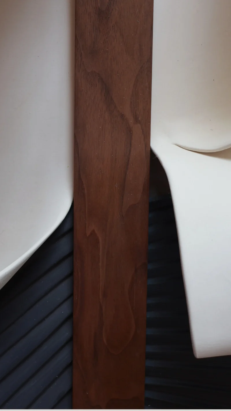 With this piece, Studio Ēeme explores the contrast of black and white, softened by the rich, warm tones of walnut wood. The superposition of waves brings a more dramatic edge to this piece, which is both feminine and powerful.
