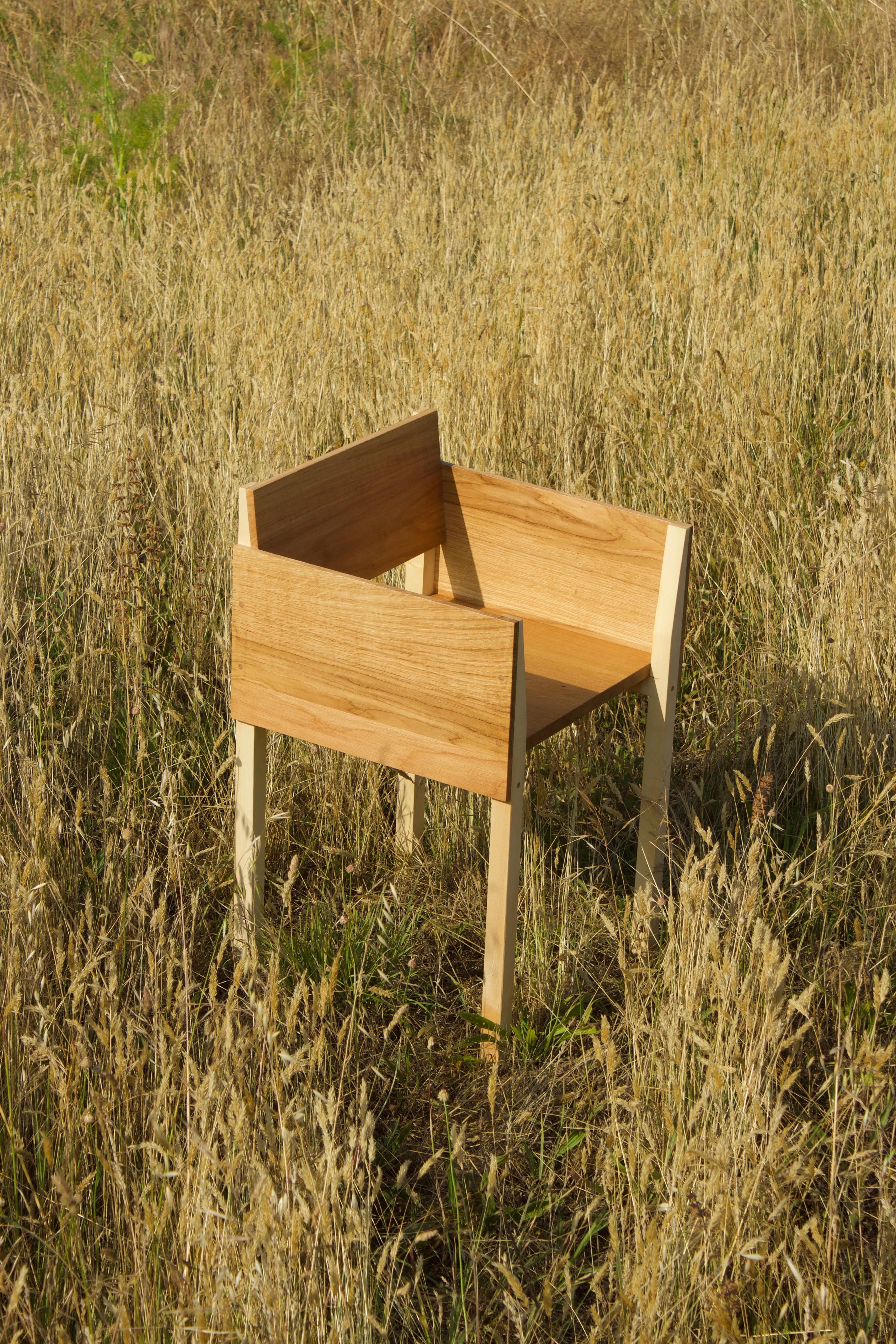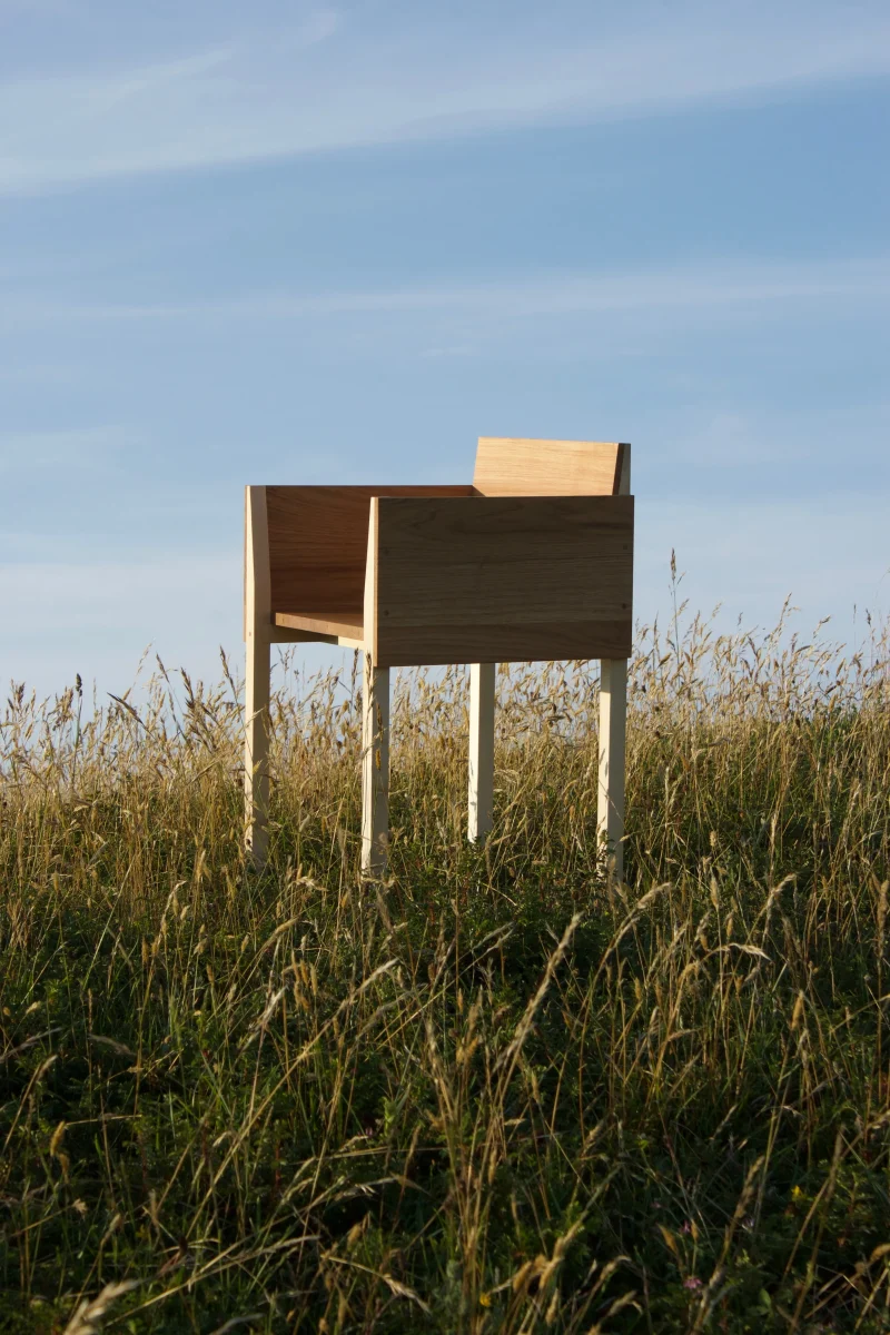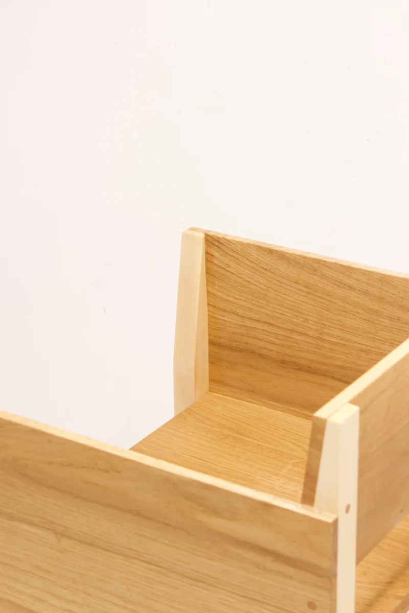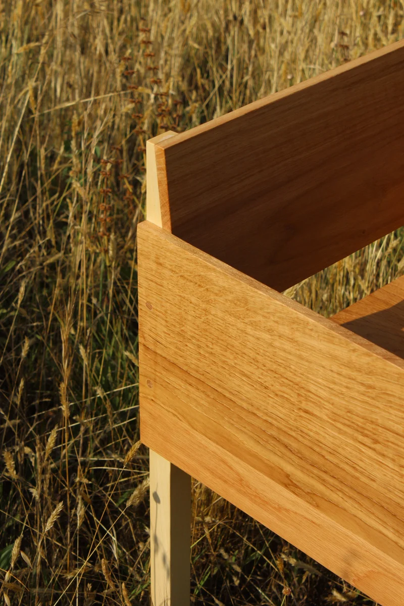 The object allows a dialogue between two wood species: oak for its outer shell, and sycamore maple for its structure.