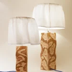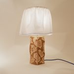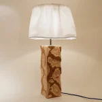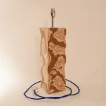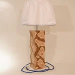 The lamp base is constructed from Teak veneered Birch plywood which has been carved away to reveal the fluid like layers. Each lamp base is unique due to the handcrafted nature.