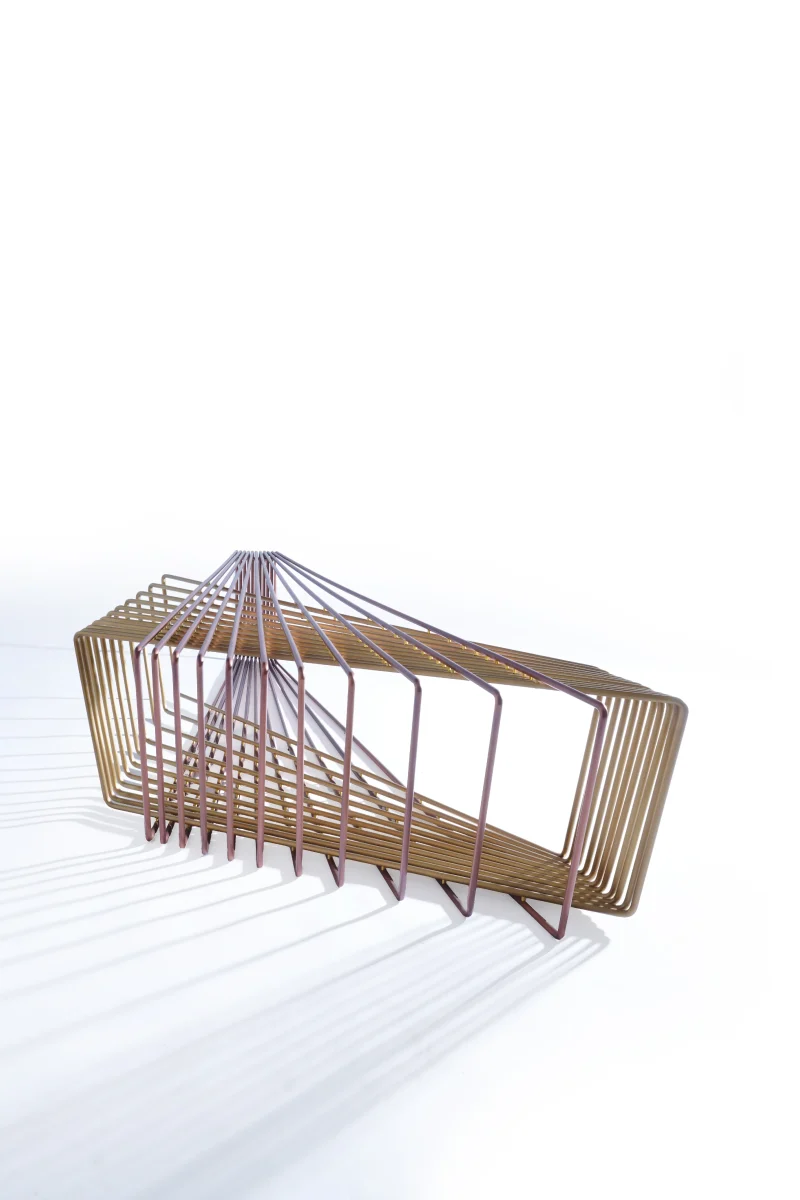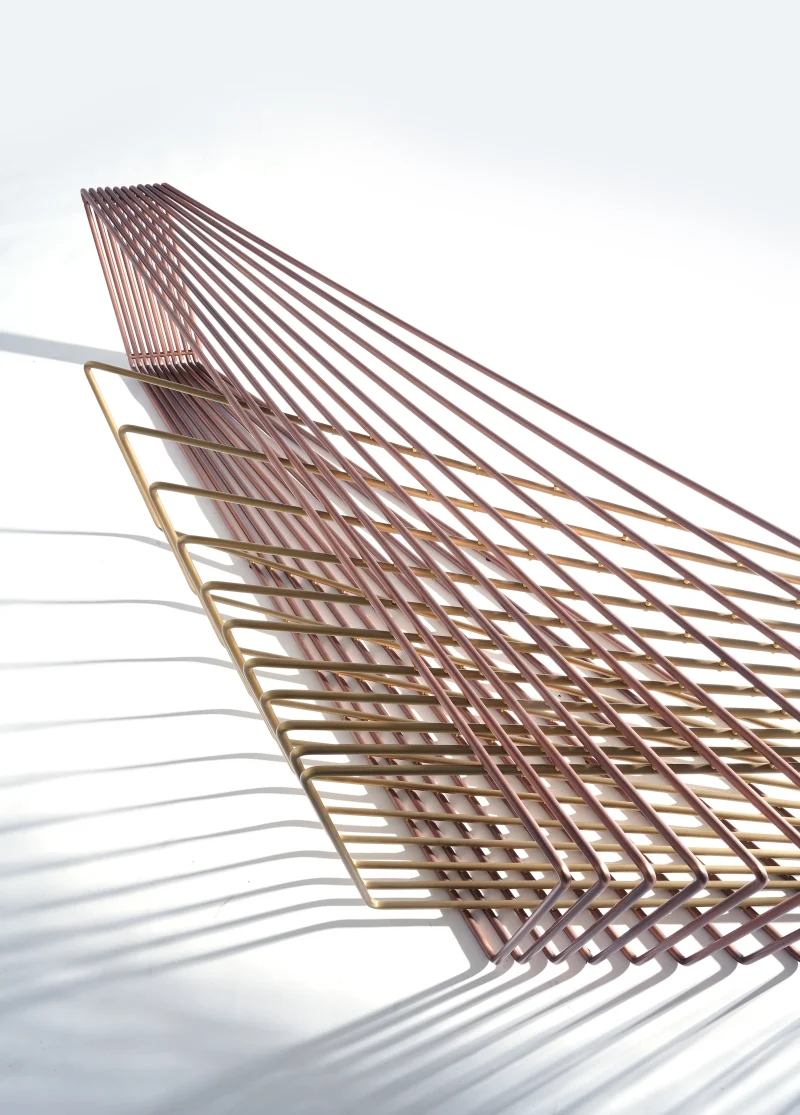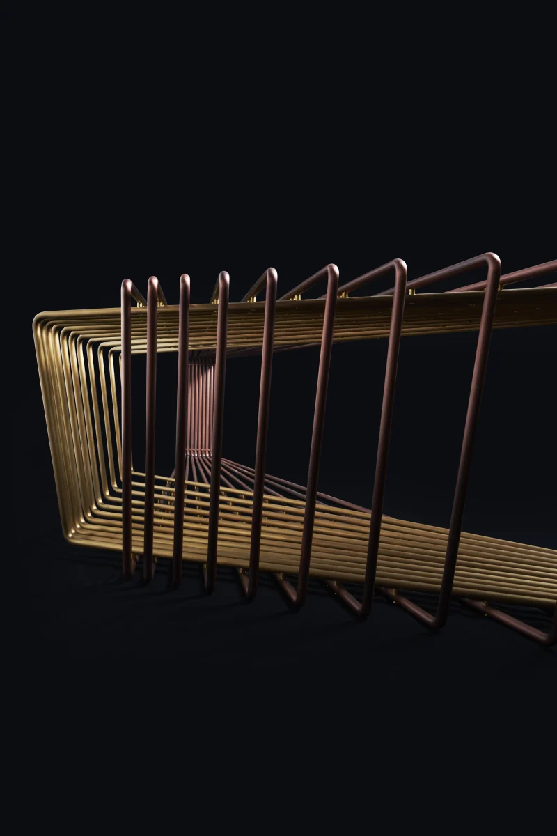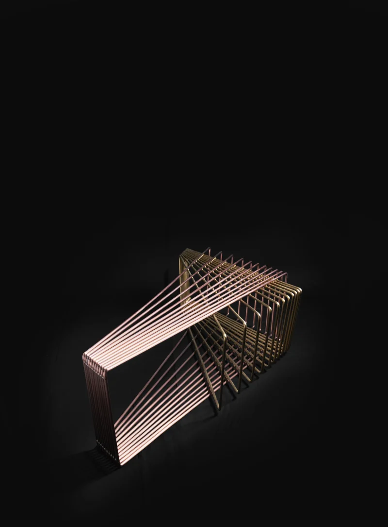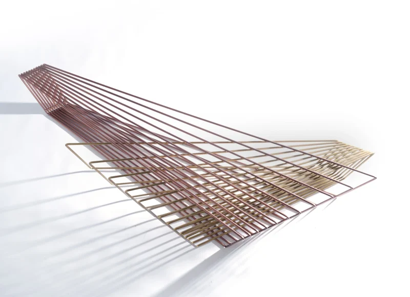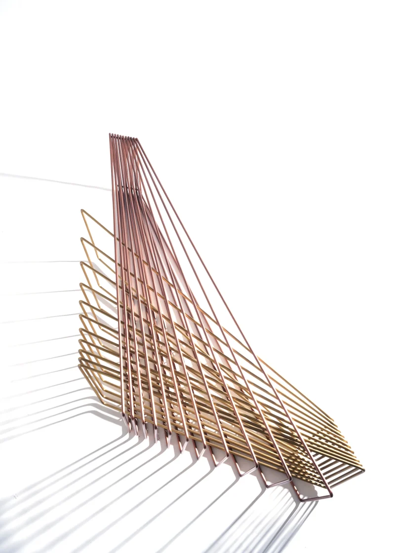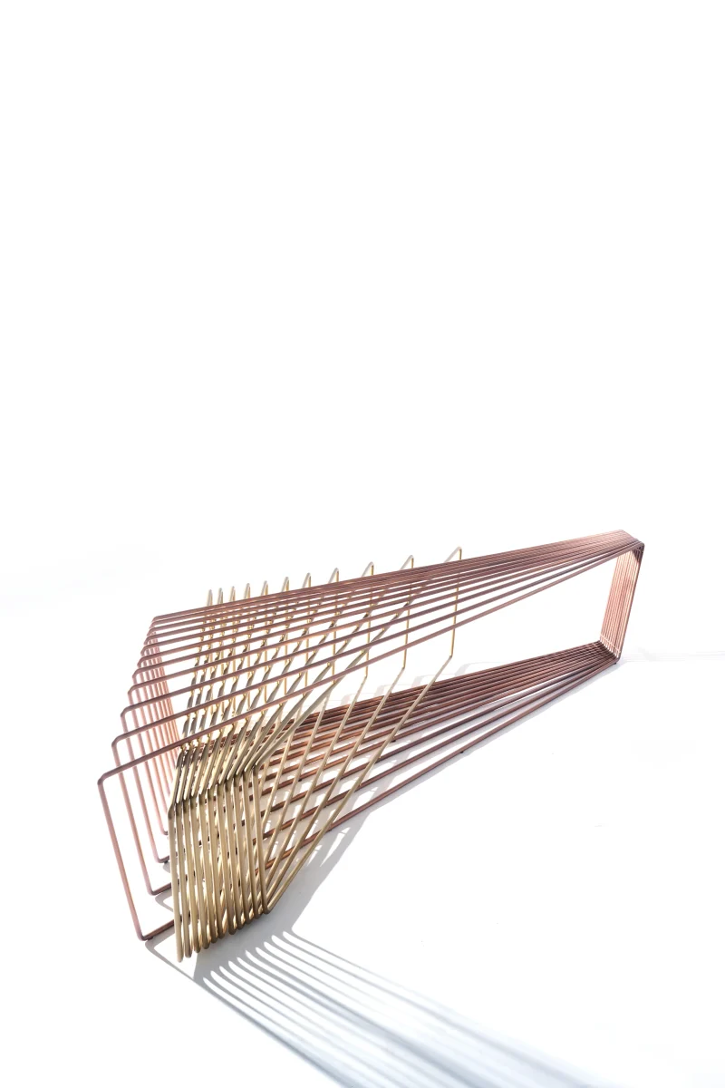 Made of brass and copper, two distinct materials, two different essences, in dialogue with each other in a geometric embrace that unfolds in space.