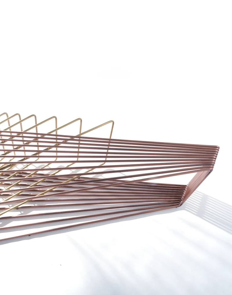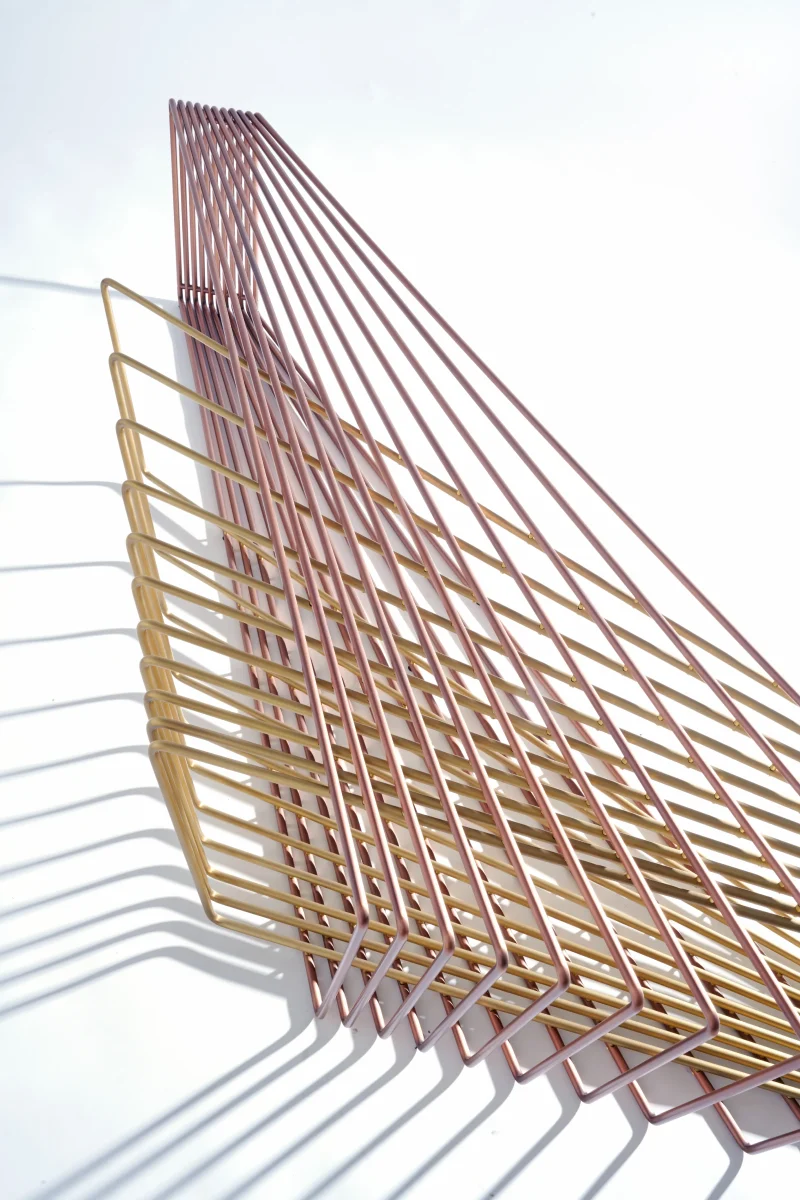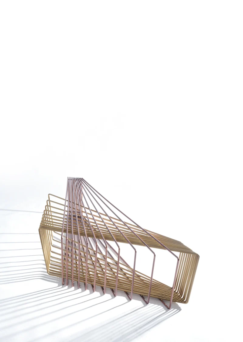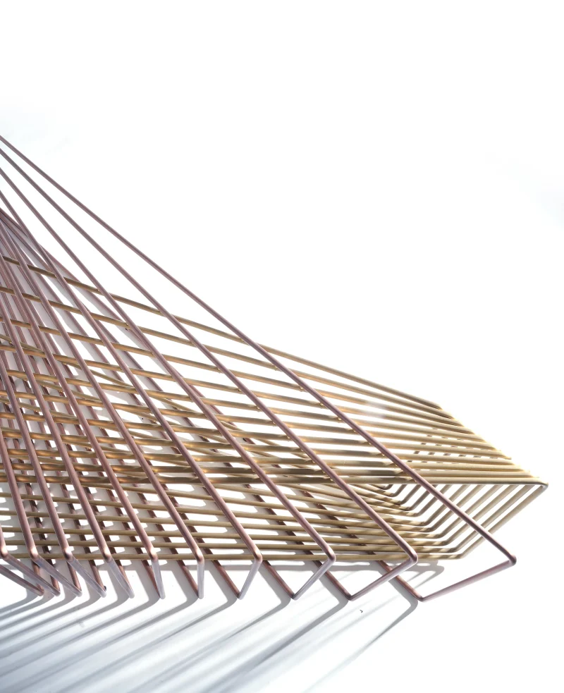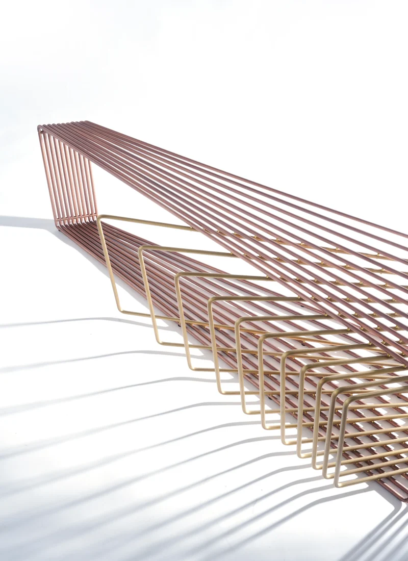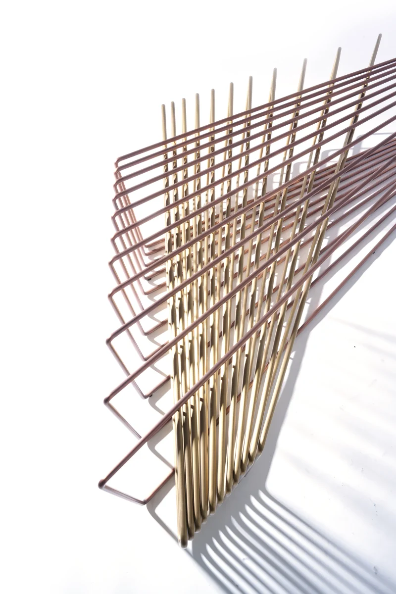 Made of brass and copper, two distinct materials, two different essences, in dialogue with each other in a geometric embrace that unfolds in space.