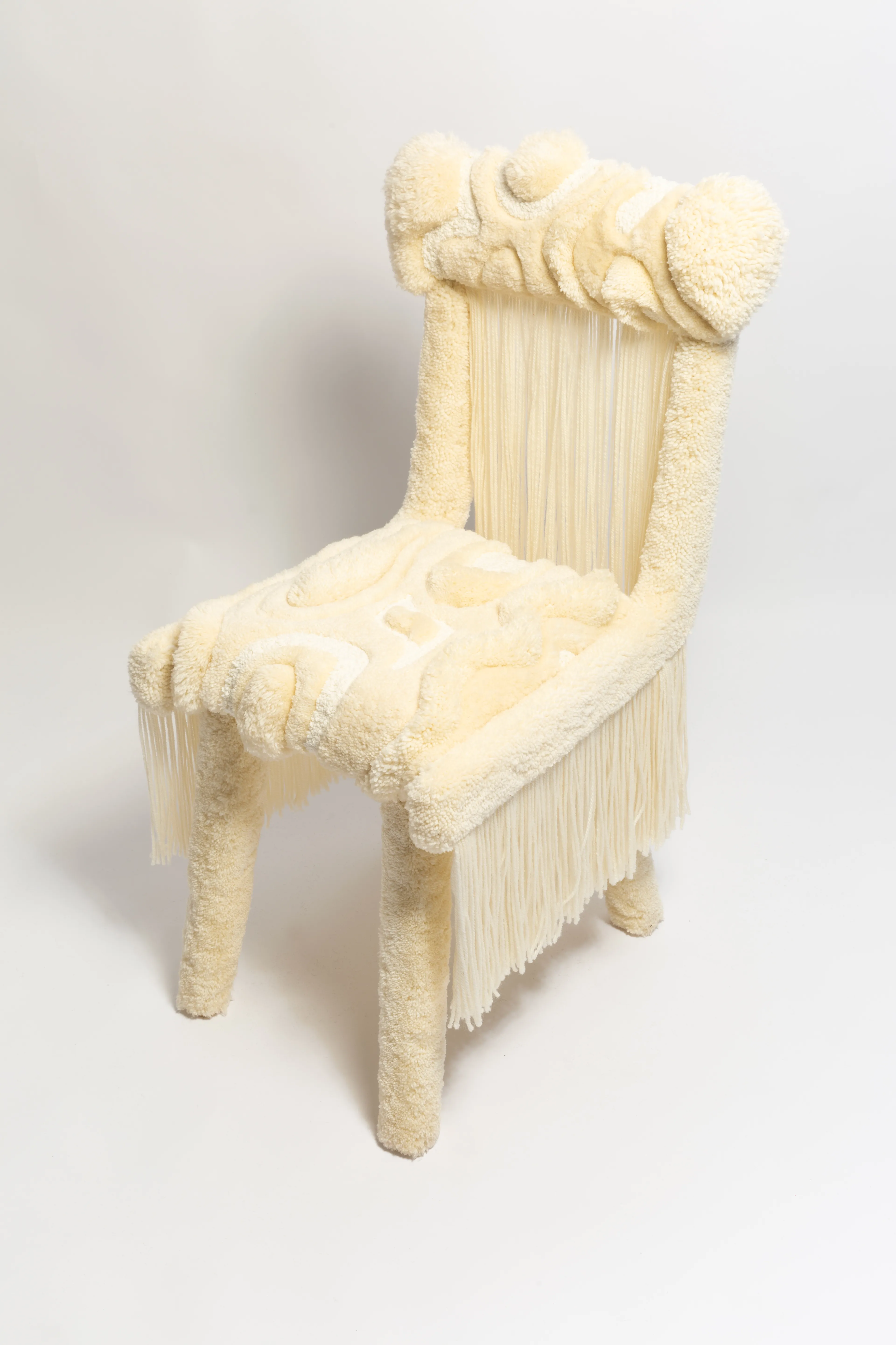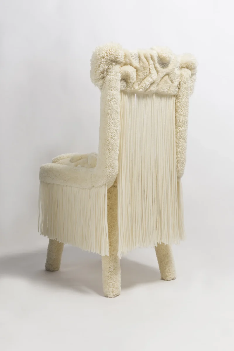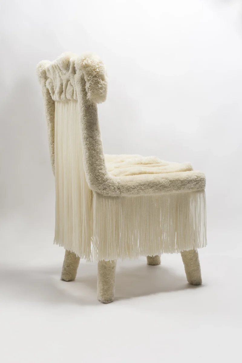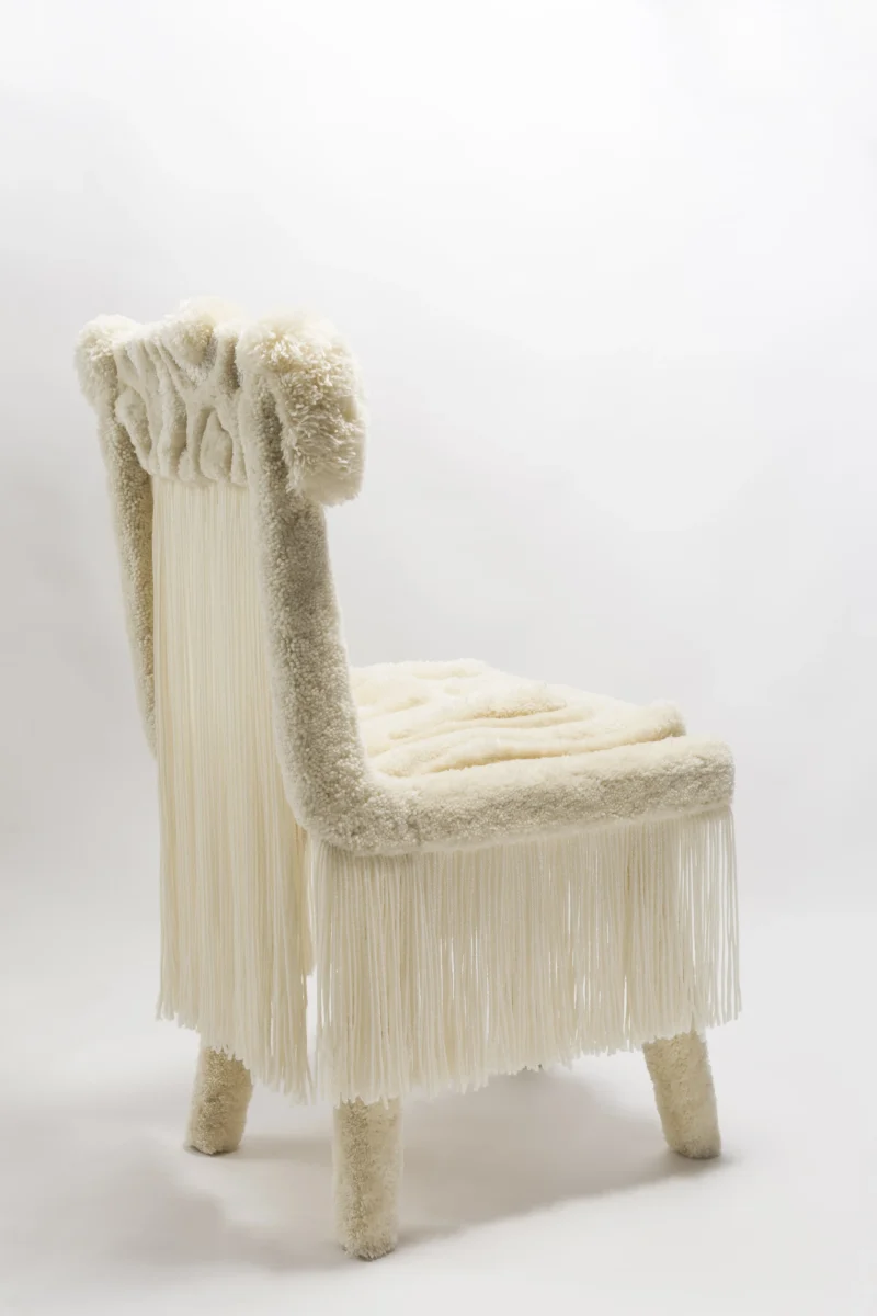 Afghan Hound accent chair bold modern chair cheeky design collectible accent chair Collectible Furniture contemporary accent chair cream wool armchair cream wool chair Designer chair designer seating Eclectic Design Functional art handcrafted designer chair handmade chair luxury handcrafted seating Maximalism Maximalist modern lounge chair modern lounge seating one-of-a-kind furniture Playful design Retro Sculptural Seating Vintage Modern wool fabric chair
