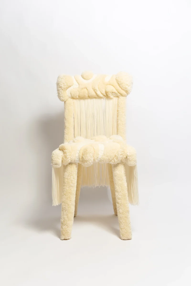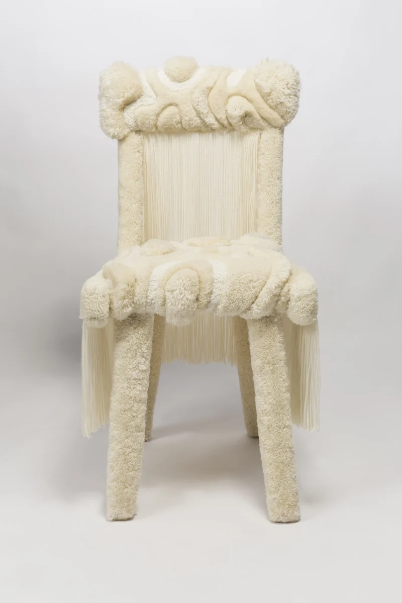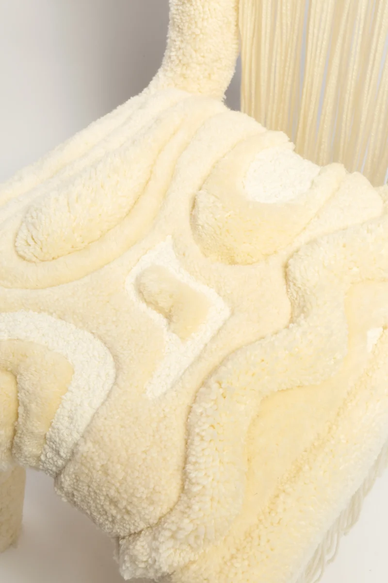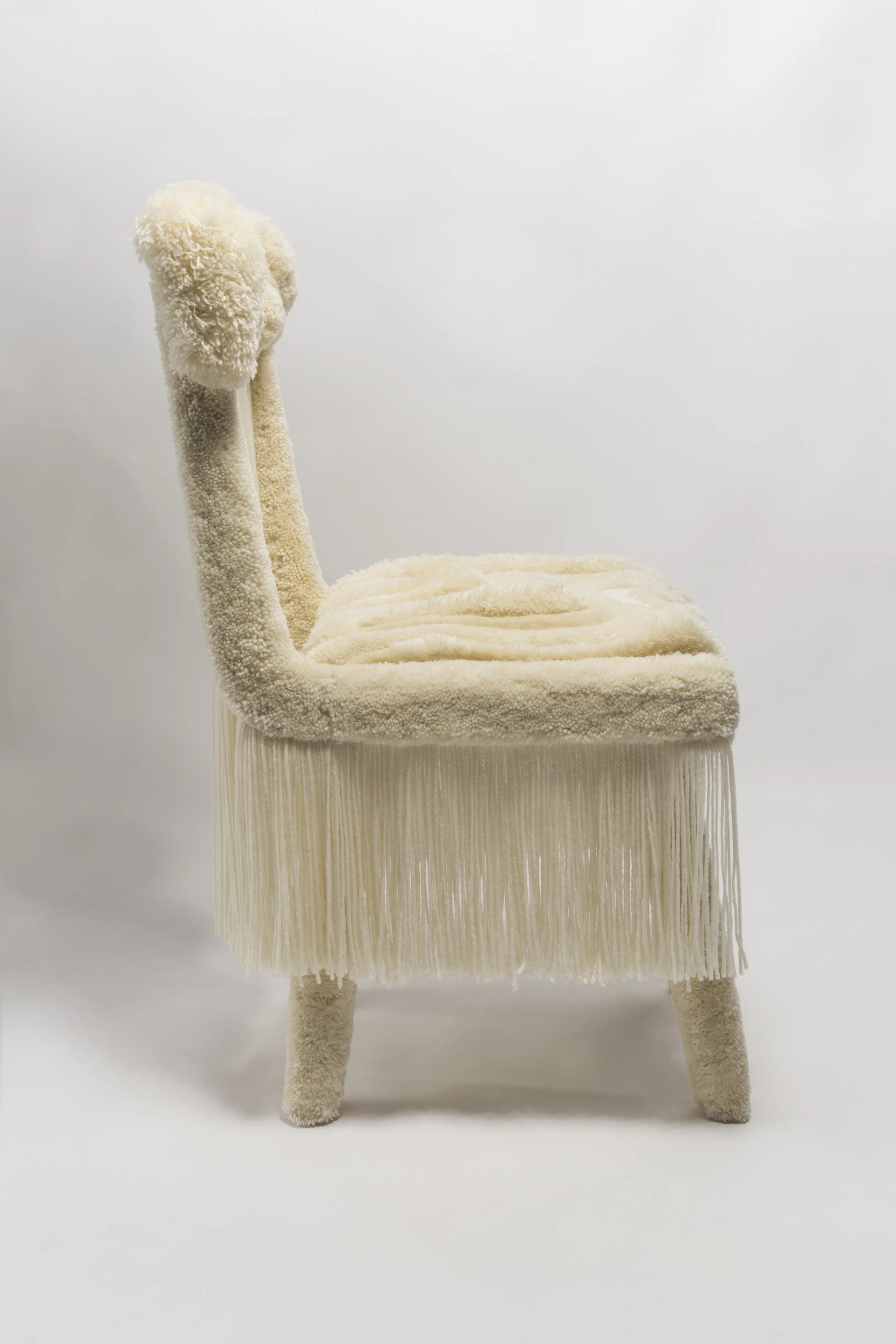 Afghan Hound accent chair bold modern chair cheeky design collectible accent chair Collectible Furniture contemporary accent chair cream wool armchair cream wool chair Designer chair designer seating Eclectic Design Functional art handcrafted designer chair handmade chair luxury handcrafted seating Maximalism Maximalist modern lounge chair modern lounge seating one-of-a-kind furniture Playful design Retro Sculptural Seating Vintage Modern wool fabric chair